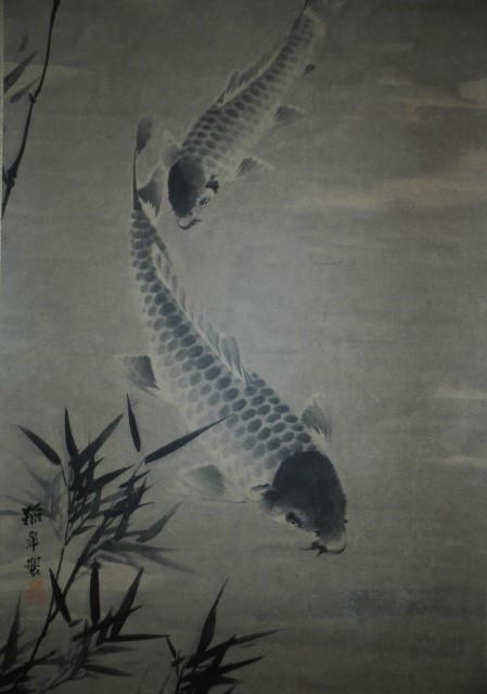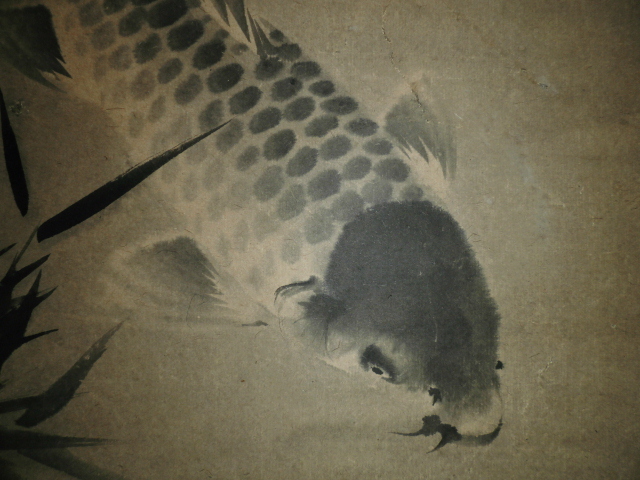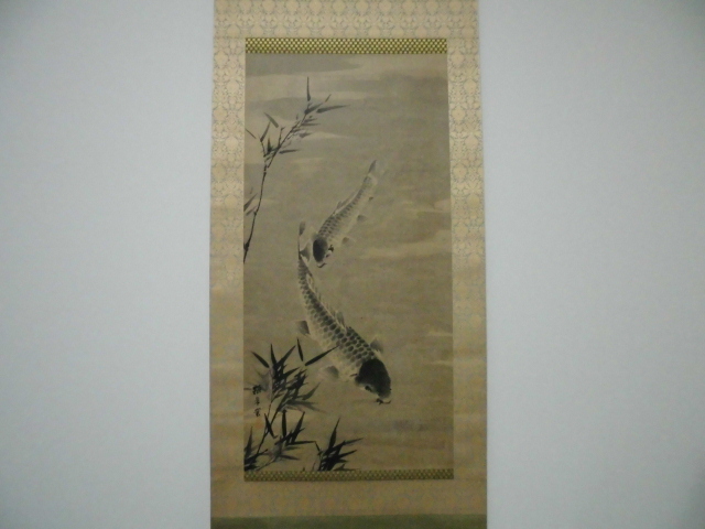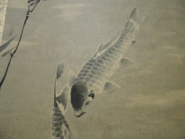 ・鑑賞やコレクションに適していると私感ですが判断しております。ご購入後に仕立て直しの必要が無い状態ですので特にお勧めします。年中掛けできる鯉の図です。本紙も表具もきれいですぐに掛けてご鑑賞いただけるお品です。軸先も木軸で綺麗です。普段は三輻対用の保管桐箱に他の掛軸(稲嶺 稲升など)と一緒に保管しています。