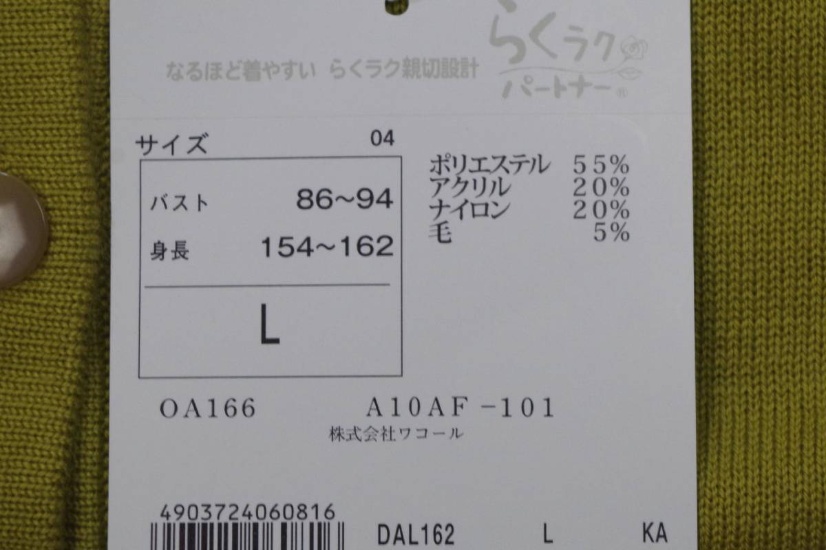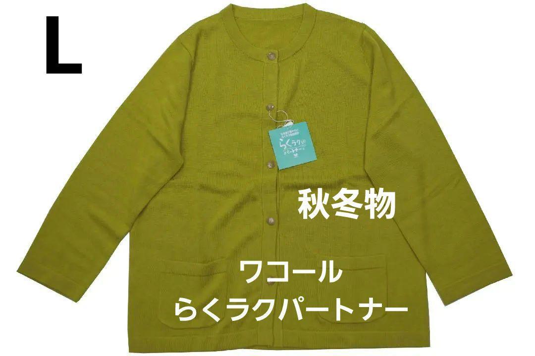 ●ワコール/らくラクパートナーの秋冬物カーディガン 、新品です。ワコールのシニア向けブランド“ らくラクパートナーのお品で”なるほど着やすい らくラク親切設計をコンセプト作られたブランドです。サイズはLサイズでバスト86-94㎝。身長154-162㎝。 素材はアクリル77%、レーヨン20%、毛3%のやや厚手の素材。無地のクルーネックで合わせやすいお品です。色はマスタード系です。