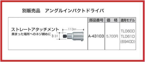 | A-43103 | 5,700円 | TL060D,TL061D (6940D) ()内のモデルは生産中止モデルです。 |