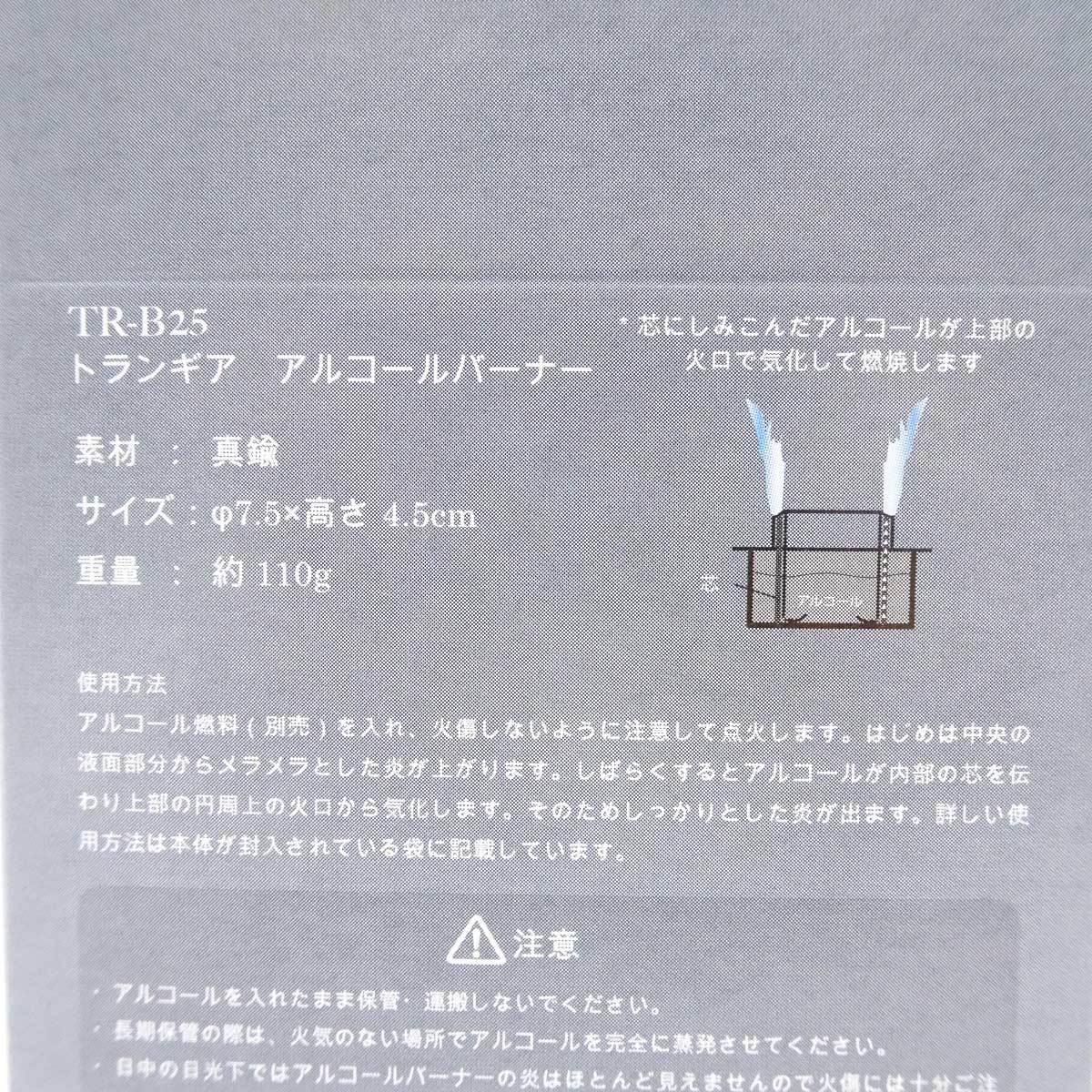 ※商品は画像にあるものがすべてとなります。 【仕様】 ブランド:トランギア タイプ:アルコールバーナー スピリットバーナー [ウィンドシールドゴトク(TR-281)付] 型番:TR-B25 重量:110g 収納時サイズ:径7.5×高さ4.5cm 材質:真鍮 |