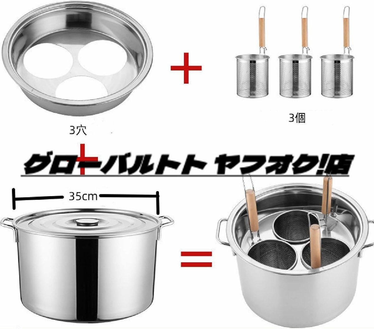 推薦 業務用店舗用 そばゆで釜 茹麺鍋セット リング付 ザル付 3*13cm ステンレス IH対応 ふきこぼれない 3穴 S1165