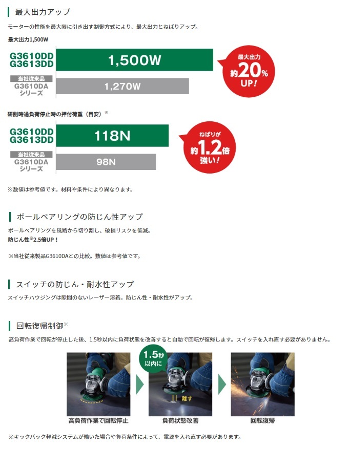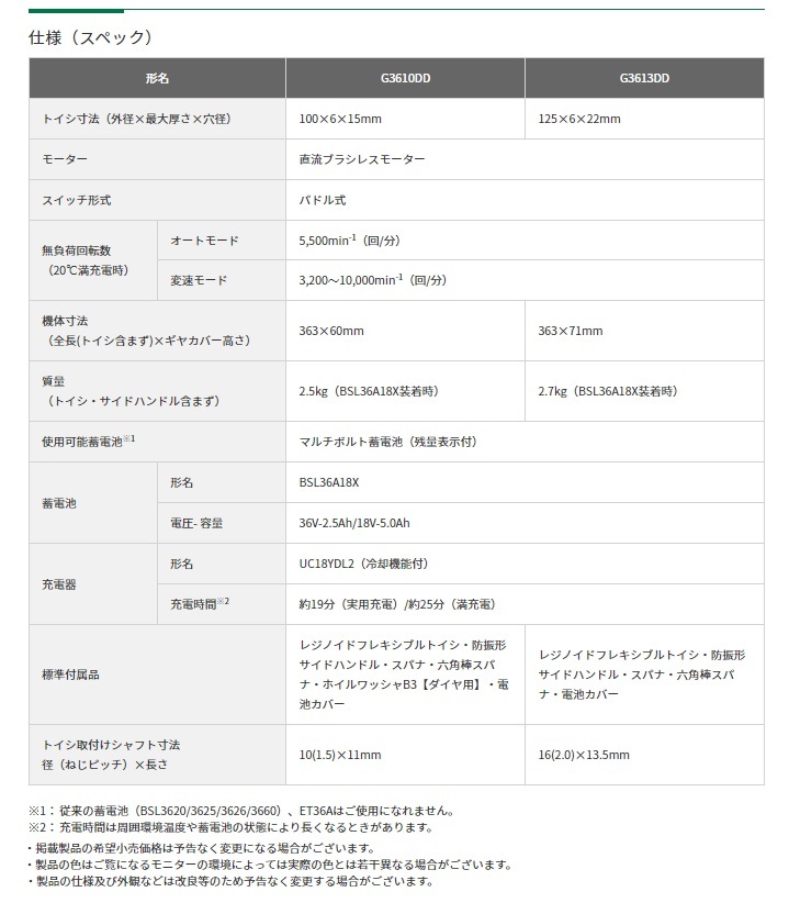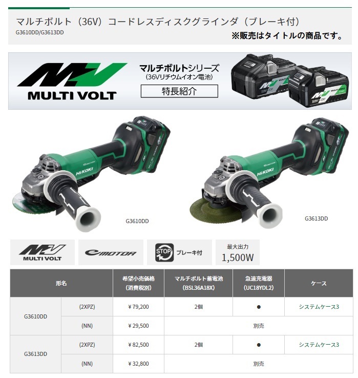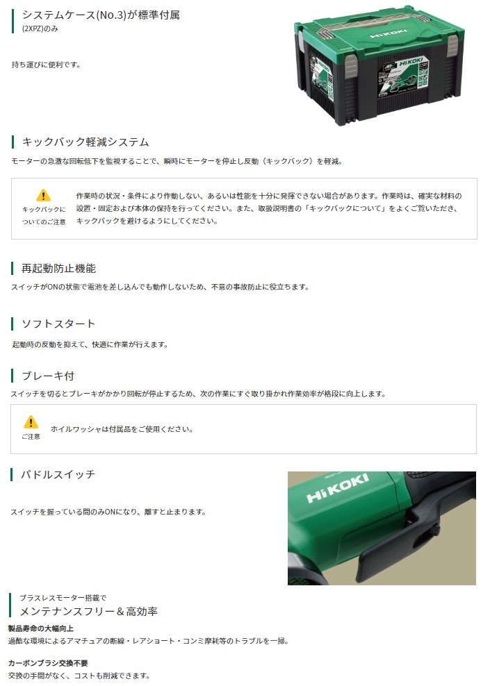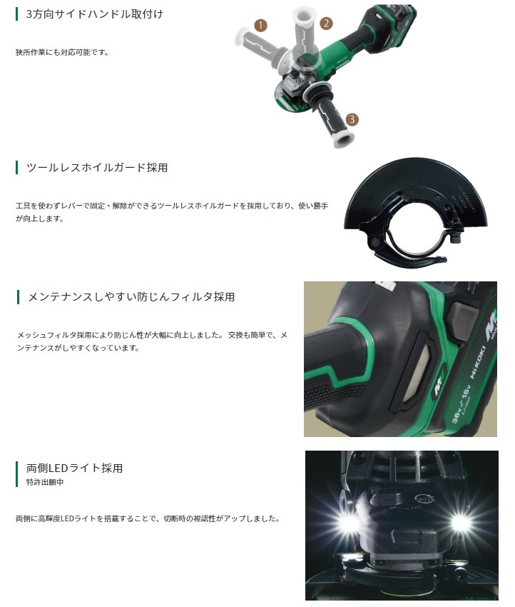 HiKOKI ハイコーキ(旧日立工機)マルチボルトシリーズコードレスディスクグラインダ(ブレーキ付)G3610DD(NN)本体のみです。※バッテリ・充電器・ケースは別販売品です。■最大出力アップ■ボールベアリングの防じん性アップ■スイッチの防じん・耐水性アップ■回転復帰制御※※キックバック軽減システムが働いた場合や負荷条件によって、電源を入れ直す必要があります。■細径ボディ■無段変速ダイヤル・オートモード機能搭載■3方向サイドハンドル取付け■ツールレスホイルガード採用■メンテナンスしやすい防じんフィルタ採用■両側LEDライト採用(特許出願中)■キックバック軽減システム■再起動防止機能■ソフトスタート■ブレーキ付■パドルスイッチ■ブラスレスモーター搭載でメンテナンスフリー&高効率