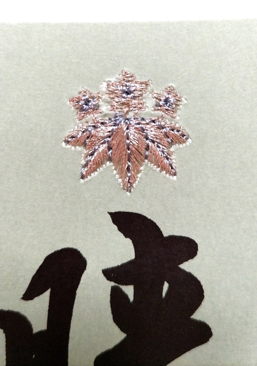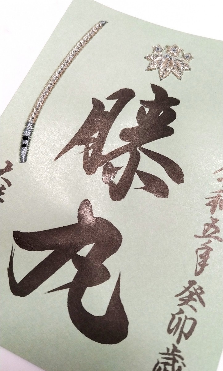 ★伊勢和紙御朱印の笹竜胆の家紋と太刀の部分に銀糸で刺繍が施されています