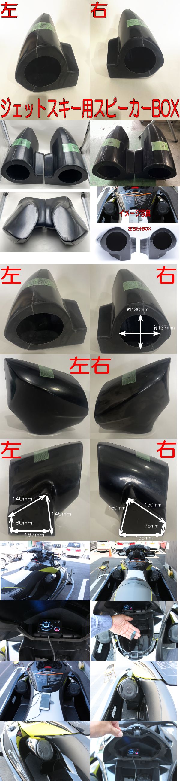 | ・ ボルトなどは付属していないのでご自身でご購入ください。 ・ 取り付けについては、分かりかねますのでご了承いただきました上でご購入ください。 ・ スピーカーケースと船体を止めるときのスポンジやクッションも加工してご自身でご購入ください。 ※ スピーカーケースと船体本体との間のスポンジは絶対取り付けないとダメではないですが、取り付けたほうが良いかと思います。 ちなみに私は厚み1㎝のスポンジをかましています。 ・ シードゥー215などには純正のフィンを外す必要があります。 ・ 商品到着後、7日間以内のみ初期不良交換対応いたします。返金・返品はお受けできません。 ・ 画像によっては、色やイメージが多少異なる場合がございます。予めご了承ください。 ・ 落札後のキャンセル・返金は受けできません。ご理解頂ける方のみご入札をお願致します。 ・ 領収書が必要な方は、ご住所等をご連絡頂く際に「①領収書希望、②領収書の宛名」を取引ナビにてご連絡下さい。領収書の宛名の記載がない場合は発送先のお名前になります。 ・ 午後2時までのご入金確認なら、出来る限り当日発送できるようにしております。(営業日に限ります。) ・ 営業時間 AM10:00~PM05:00 定休日 土曜・日曜・祝祭日 ・ 輸送途中で小さな傷がある場合もございます。ご了承できる方の入札お願い申し上げます。 |