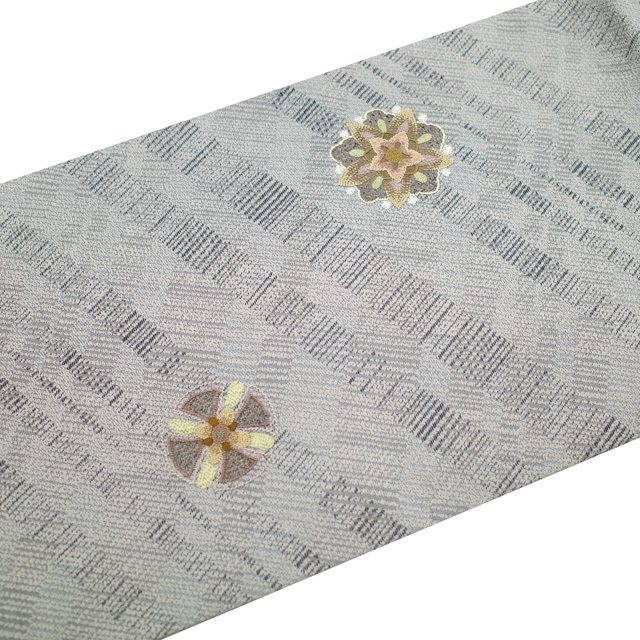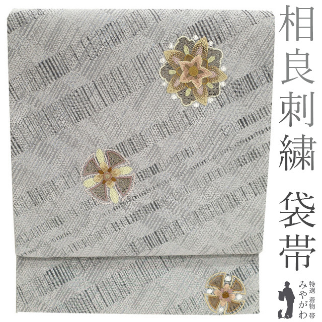 【中古】 袋帯 相良刺繍 高級 手刺繍 上質 正絹 金銀糸 グレー 華文 おしゃれ カジュアル 普段着 お出かけ ショッピング 観劇 コンサート お散歩 販売 購入 リサイクル 美品 中古 仕立て上がり みやがわ sb51876