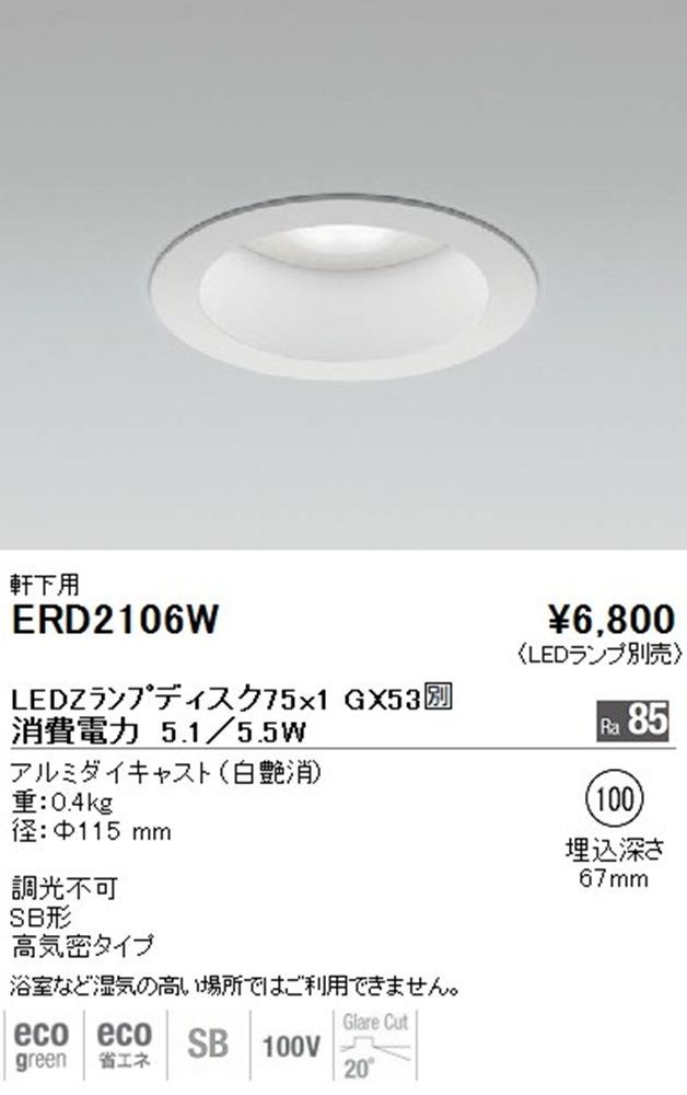 防湿LEDダウンライト 本体のみ 調光不可 遠藤照明 ERD2106W