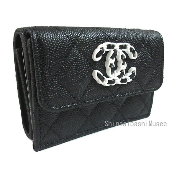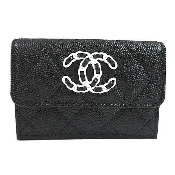 | 新品。箱・リボンのラッピング。シャネル人気のナインティーンシリーズのスモールフラップウォレット。シャネルチェーンの大きなCCマークがシャネルらしいブラック×白でキャビアスキンがとても可愛くてオシャレな仕上がりのスモールウォレットです。Brand new. Box/ribbon wrapping. Small flap wallet from Chanel's popular Nineteen series. This is a small wallet with a large CC mark on the Chanel chain and caviar skin in black and white, which is typical of Chanel, and has a very cute and stylish finish. |