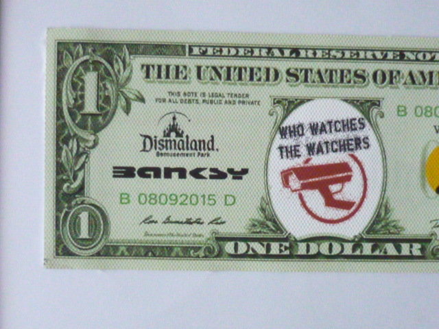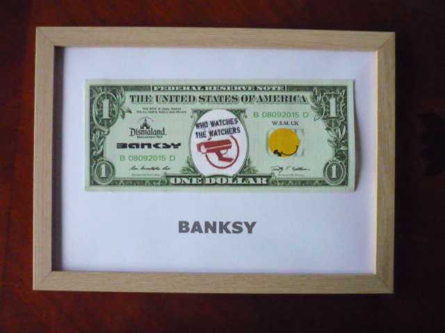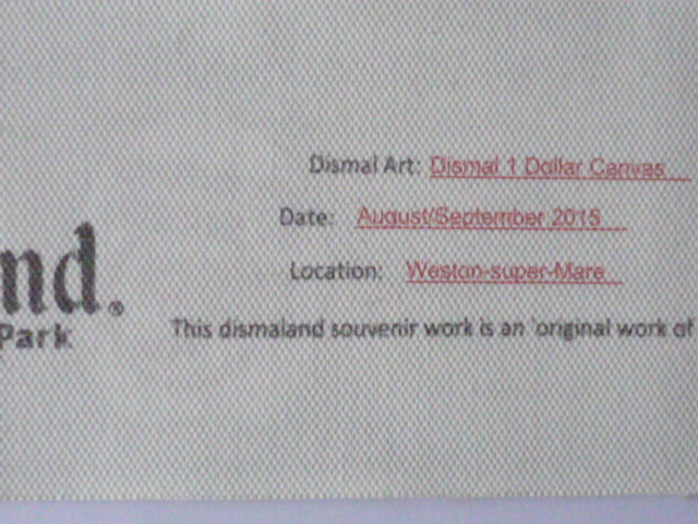 バンクシー Banksy (Banksy Dismaland ) 作品タイトル → ディズマル紙幣 1ドル 一枚の出品です。 ↓ ※ 1ドルのサイズ ↓約 約20.5 cm x 約9 cm 厚さ約 1mm ↓ ★出品の作品は、キャンバス生地です。 生地は柔らかい素材で掲載写真は丸まって見えたり、 曲がって見えますが額に入れますと綺麗になります。 ホテル内の倉庫を整理中に偶然見つけた ディズマル紙幣 です。(下記参照) BANKSYサイン入り ★未使用 ★本物保証