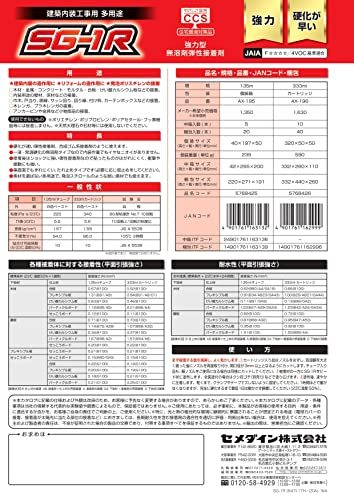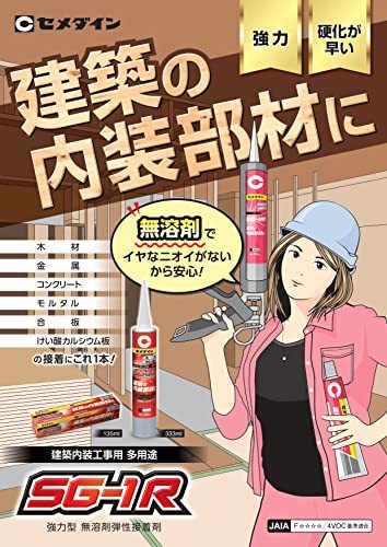 ・赤、白 333ml AX-196・保存期限:有(製造年月日から、12か月)、製造年月日表記:有・内容量:333mL・張合せ可能時間:10分以内(23度)・5分以内(30度)・密度:1.50~1.60g/cm3・ホルムアルデヒド放散等級区分:Fフォースター(JIS)、仕様:4VOC基準適合(JAIA)【特長】 硬化が早い弾性接着剤。合成ゴム系接着剤のように使用できます。 一液・常温硬化の無溶剤タイプなので内装作業でもイヤなニオイがありません。 接着後はショックに強い弾性接着剤なので貼ったものが剥がれにくく、衝撃や振動にも強いです。 垂直面でもずれにくい、たれ止めタイプです。(必要に応じて仮止めをしてください。) 素材を選ばない多用途タイプなので、発泡スチロールのような弱い素材でもご使用いただけます。 【用途】 【用途】 木材・金属・コンクリート・モルタル・合板・けい酸カルシウム板などの接着 内装用途の壁材、床材などの接着 巾木・戸当り・胴縁・サッシ回り・回り縁・付け枠・カーテンボックスなどの接着 木レンガ・プラ木れんがの接着 アンカーピンや金具など小物部品の接着 【使用上の注意】 保護手袋/保護衣/保護眼鏡/保護面を着用すること。 換気の良い場所で保管すること。涼しいところに置くこと。 施錠して保管すること。 直射日光を避け容器を密閉し5℃~35℃で保管する。
