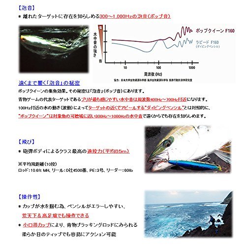フローティング・B04C 生シラス 160mm 4510001581256・・Color:B04C 生シラスSize:160mm・主な対応魚種:ブリ 青物・タイプ:フローティング・サイズ:160mm / 重量:65g・カラー:生シラス B04C・フックサイズ:ST-66 #2/0青物の本能を刺激するポップ音! 青物の代表的なターゲットであるブリが最も感じやすい水中音は周波数400Hz~700Hz付近になります。100Hz付近の水の動きによってターゲットの近くでアピールするダイビングペンシルとは対照的に、ポップクイーンは対象魚の可聴域に近い300Hz~1000Hzの水中音で遠くからでも存在を知らしめます。また砲弾ボディによるクラス最高の遠投力平均85m(※使用タックルによって飛距離は変わります。)を誇り、広域でターゲットを探る事が可能となりました。操作面でも荒天下・高足場でも操作しやすく、青物プラッキングロッドにみられる柔らかめのティップでも容易にアクションが可能です。