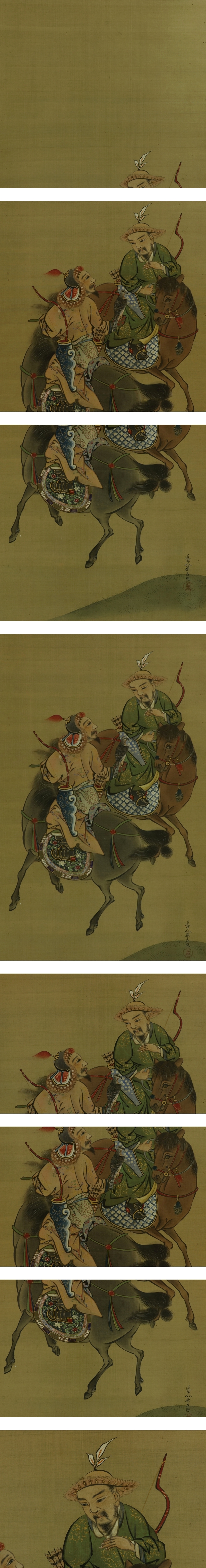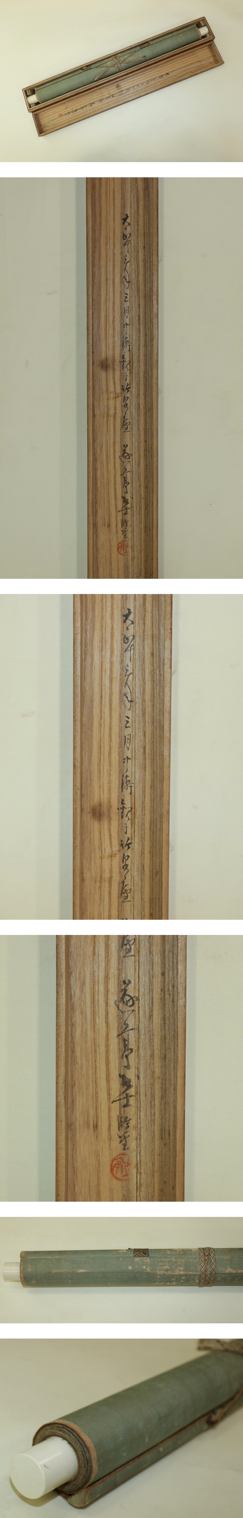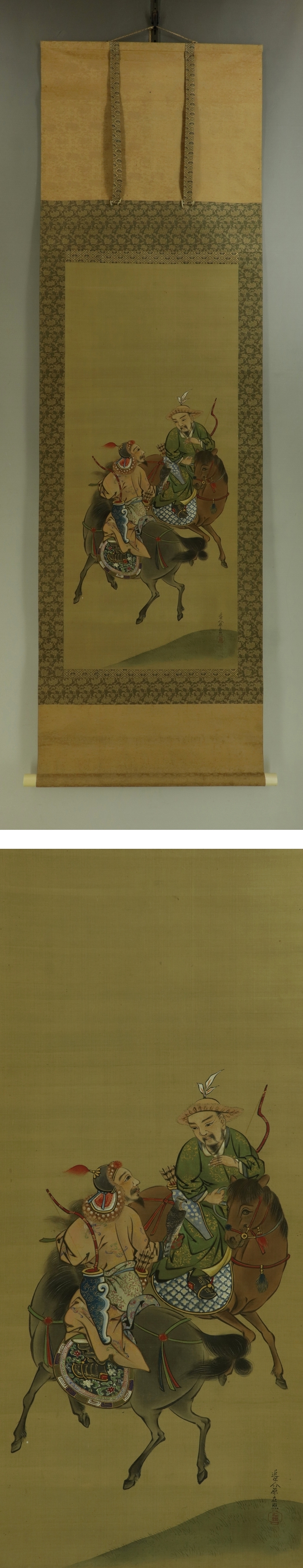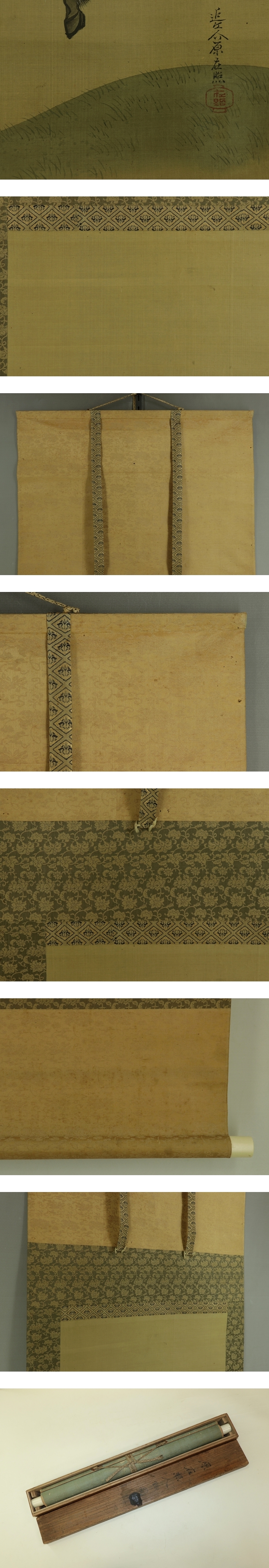 原在照 はら-ざいしょう(1813-1872*) 江戸後期-明治時代の画家。 文化10年生まれ。原在明の娘婿。画法を養父に学び,原派3代を継ぐ。 安政の内裏造営のとき障壁画を描いた。明治4年12月21日死去。59歳。 字は子写。別号に観瀾,夕鸞。 本紙は、染み、汚れ、軽い折れ、軽い皺、浮き、ヤケがあります。 表装は、染み、汚れ、折れ、皺、虫食い、破れ、ほつれ、箱に傷みがあります。 【サイズ】 作品 横約41cm×縦約97cm 表装 横約53cm×縦約176cm |