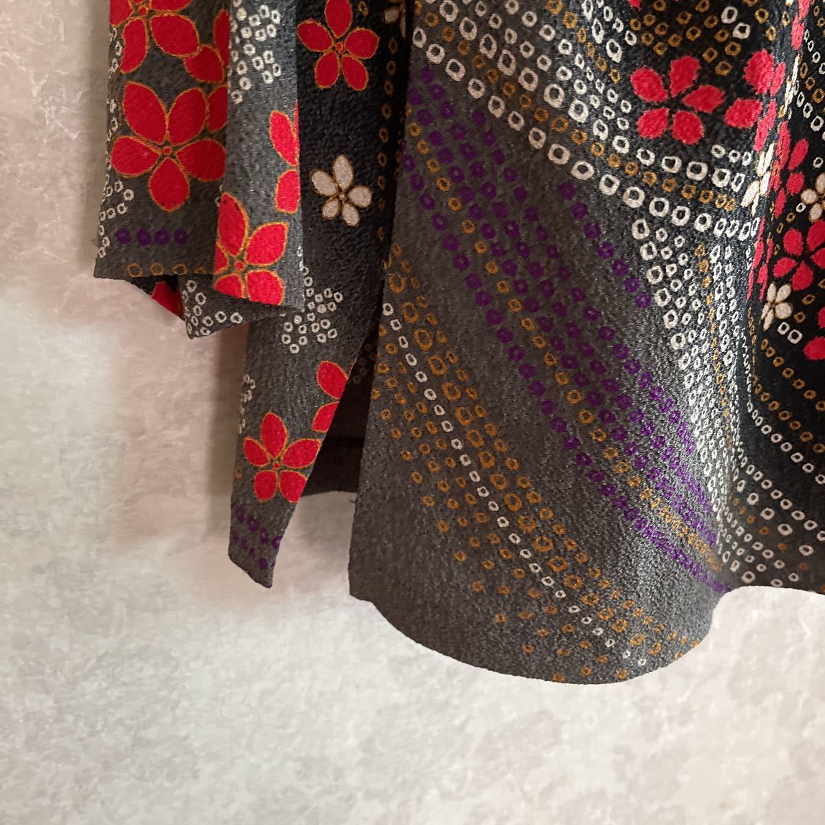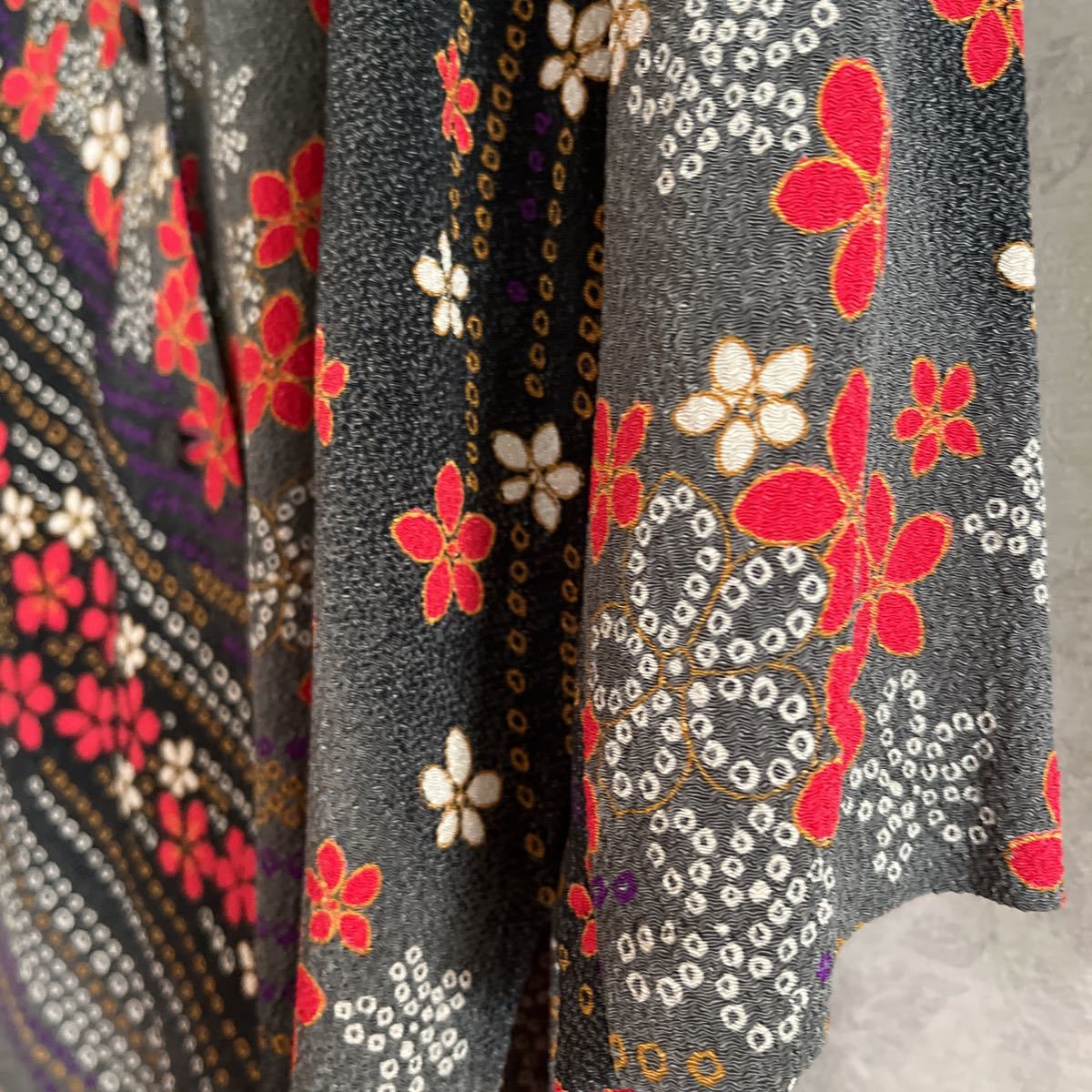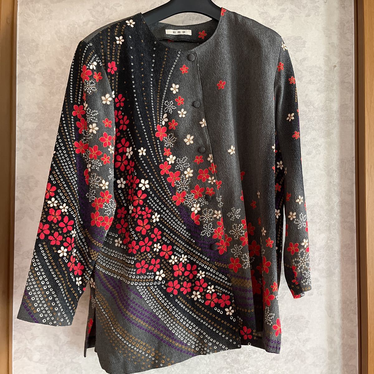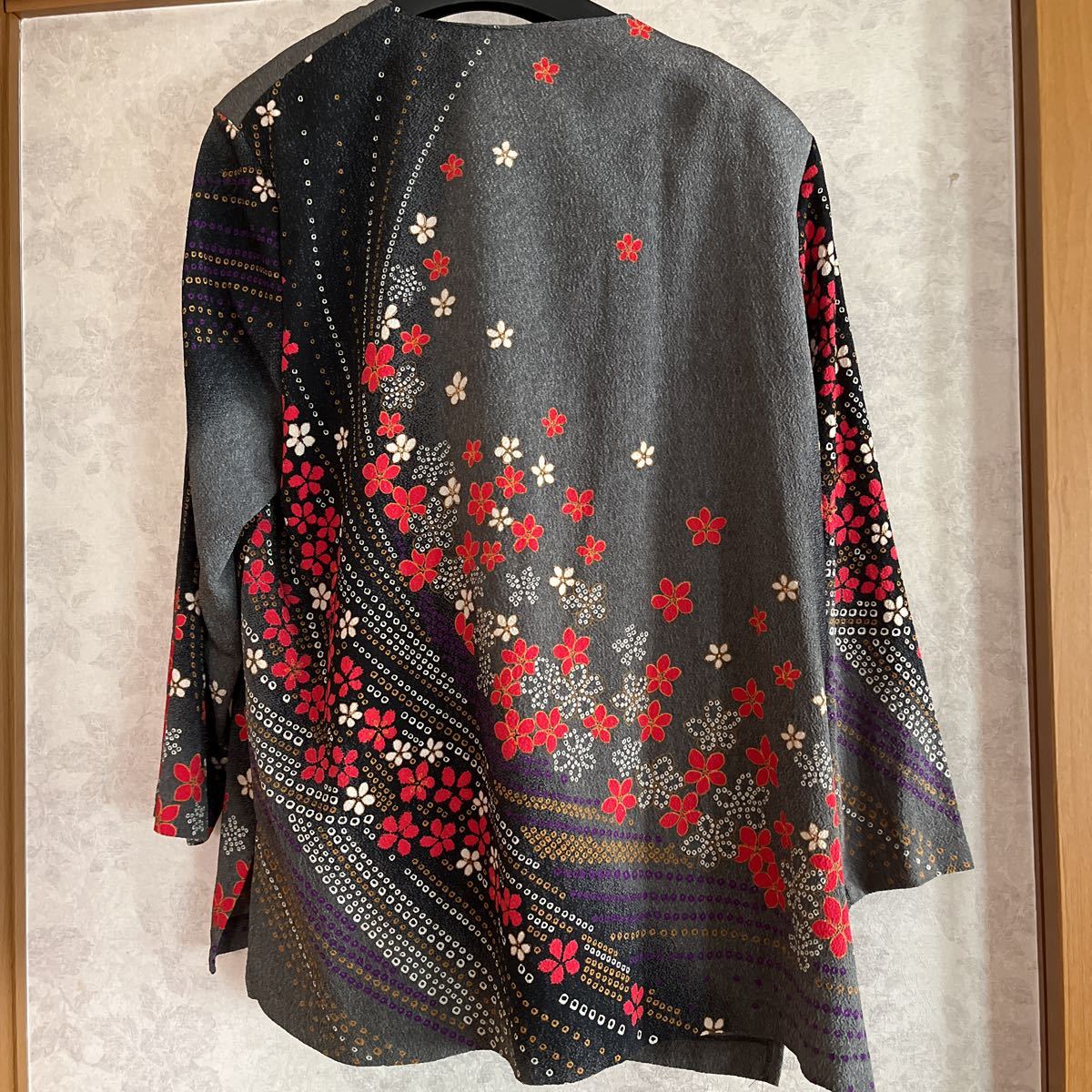 ★★絵瑠夢★★長袖 ジャケット ちりめん フリーサイズ 裾両側スリットあり グレー お花柄 くるみボタン ポリエステル100% 肩パッド付き です。