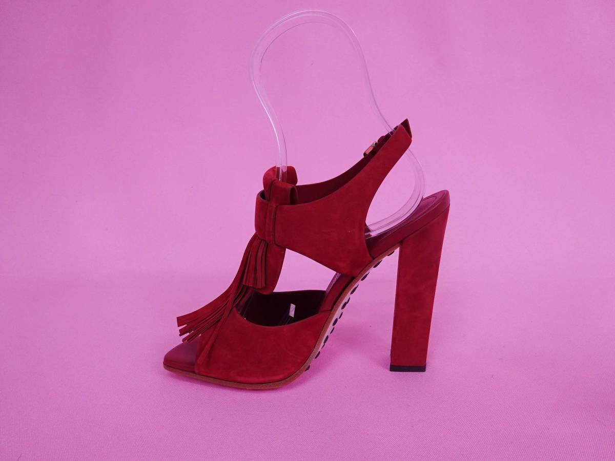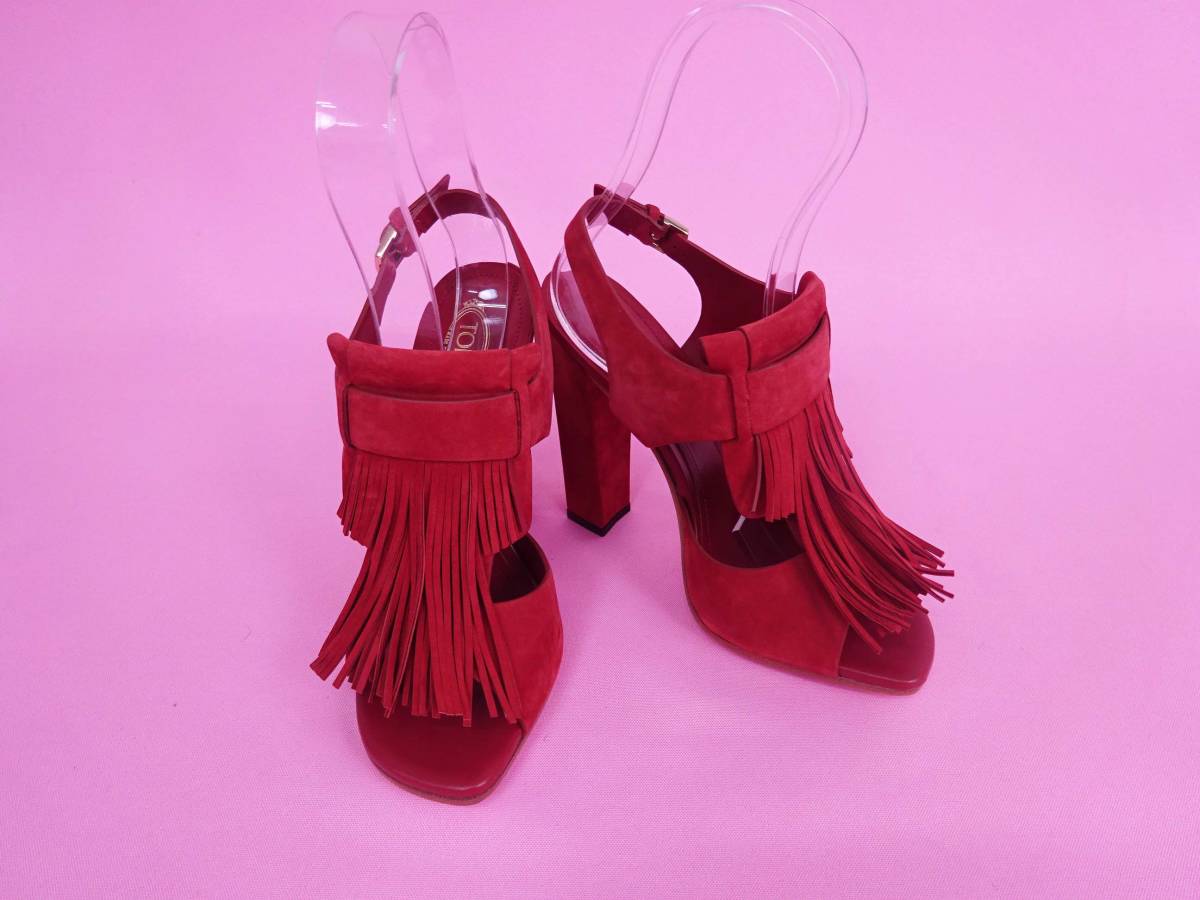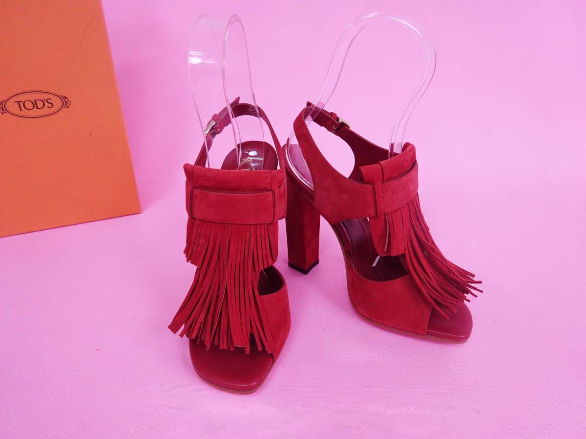 TOD’S トッズ フリンジ飾り アンクルストラップ サンダル  チャンキーヒール スエード キャメルブラウン ほぼ新品