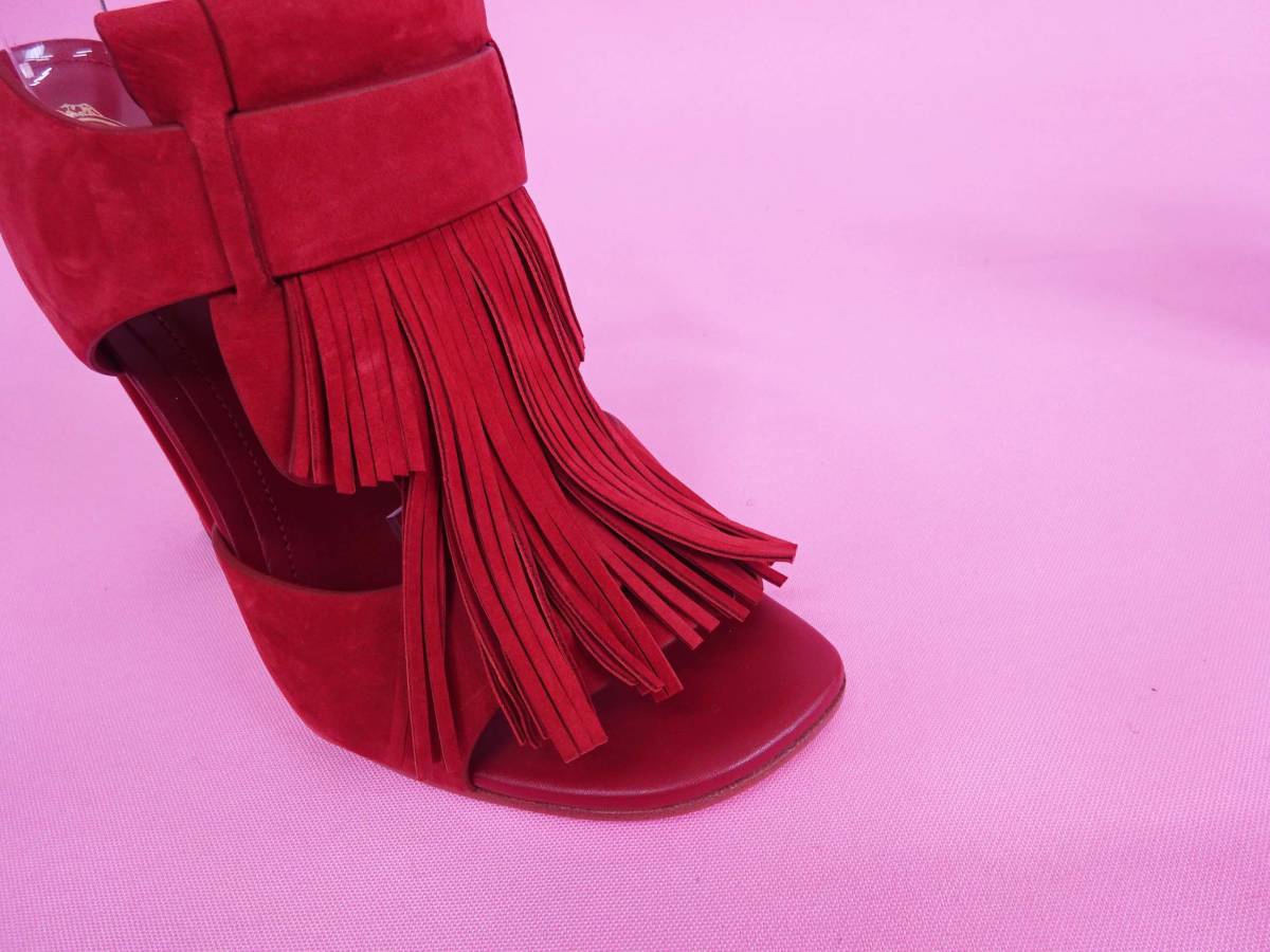 スエード素材を用いたサンダルで、甲の部分にふんだんにフリンジを飾ったデザイン。