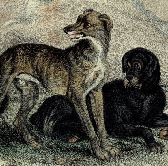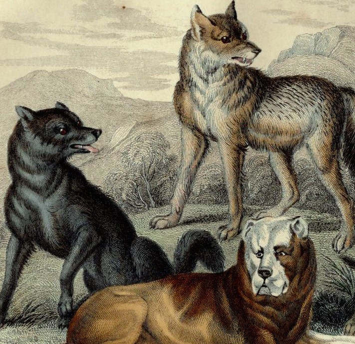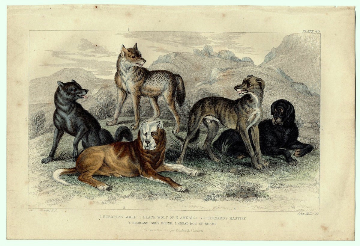 1866年 ゴールドスミス 鋼版画 手彩色 ヨーロッパオオカミ ブラックウルフ セント・バーナード グレーハウンド 博物画