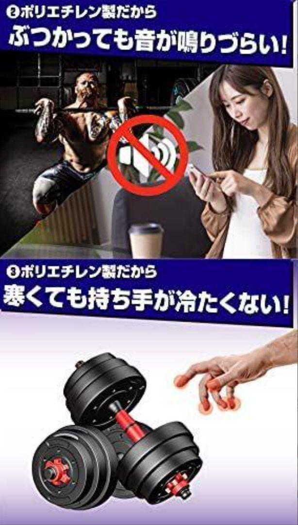 外部素材は耐久性が高いポリエチレンを採用し、また円形のデザインにしている為、 鉄製とは違い床に直接おいても傷が付きにくくなっております。ダンベル同士がぶつかっても「キンキン」と音がすることがなく周りに迷惑がかかることがありません。