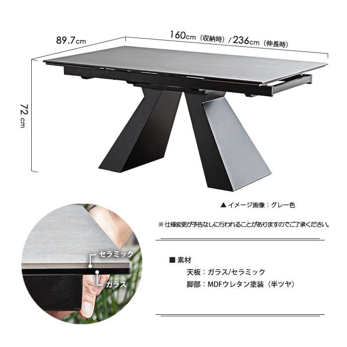 商品サイズテーブル:幅 160(伸長前)/236(伸長後)×奥行 89.7×高さ 72 (cm)
