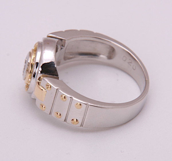 ダイアが中央に1石輝くプラチナとゴールドのコンビリングです。