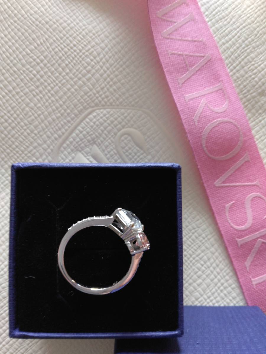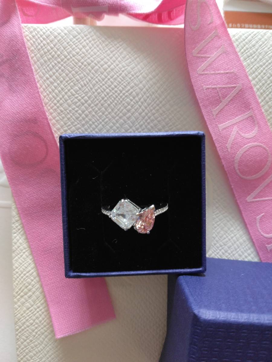 スクエアのストーンとしずく形の淡いピンクのストーンがデザインされたスワロフスキークリスタルリングです。