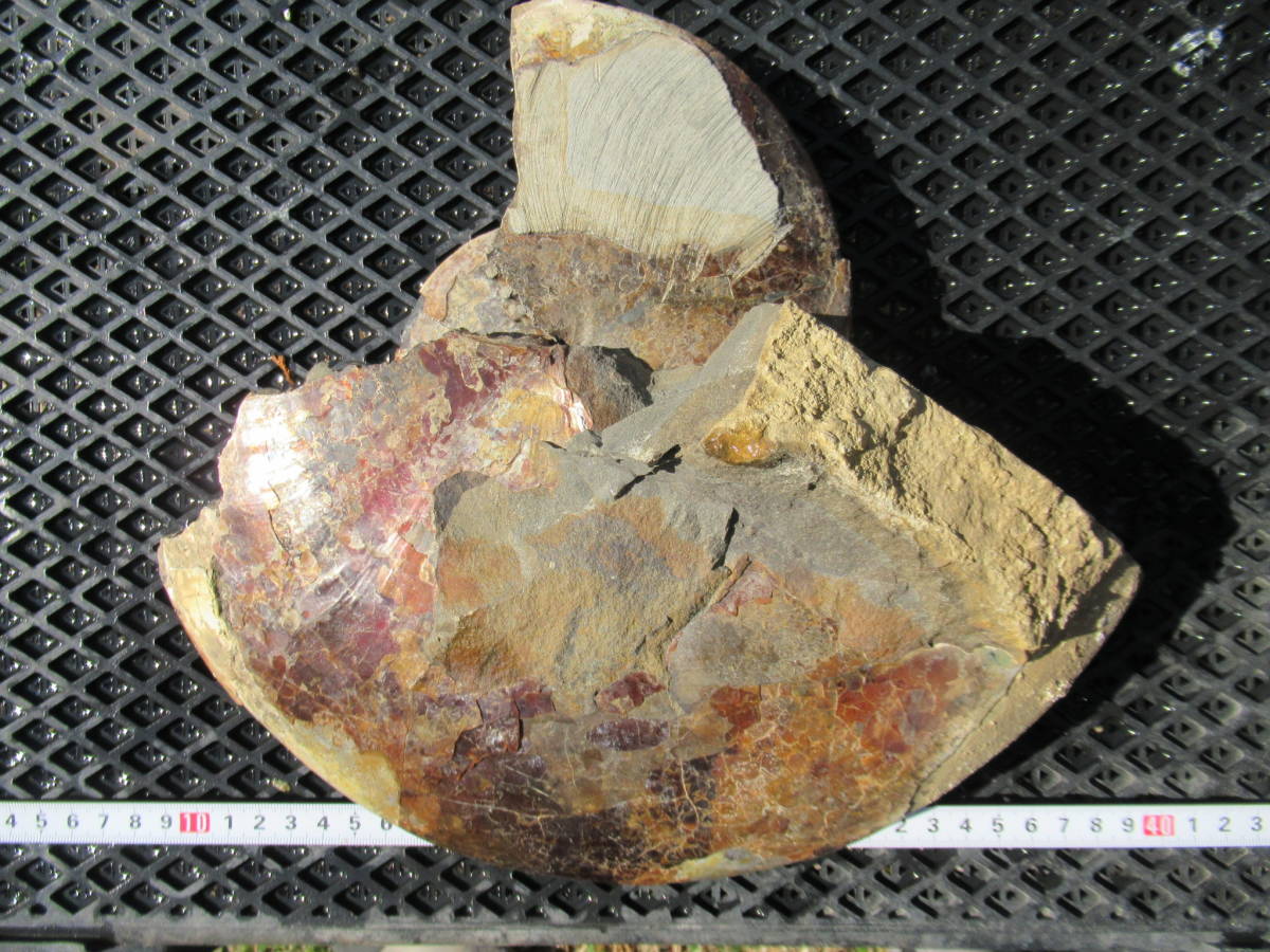 Placennticeras sp.白亜紀Pierre Shale、South Dakota。大きめのプラセンティセラスの中心近くがディスク状に残り、その外側の巻き部分の重なりをチゼルで取り除き赤を主とするイリデッセンスな殻を目立たせた形で裏側は化石表層がかなり失われています(画像10)。殻のすべての面がイリデッセンス面ではなく色が鈍い部分もあります。また中央ディスクにはイリデッセンス部分の他に縫合線部分(画像9)もあります。全体サイズ幅と高さ290/260mm、中央ディスク部分タテヨコ170/135mm。厚さ最大で80mm。送料無料。