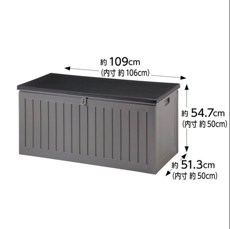 ・組み立て式の大型収納コンテナ。 ・工具不要で簡単組立(安全の為軍手などの手袋をご用意ください)。 ・組み立て時間約15分(目安の時間になります)。 ・別売の南京錠などで施錠することができます。 ・天板荷重約80kg(静止荷重) ・説明書は商品の間に入っています。 重量 :5.6kg サイズ:約幅109×奥行51.3×高さ54.7cm ※ お客様組立品になります ※ 天板荷重が約80kgありますが、安全の為上に乗ったりしないでください。 ※ 組立構造のため、大雨等の冠水による商品内への浸水は防ぐことができません。 | ||