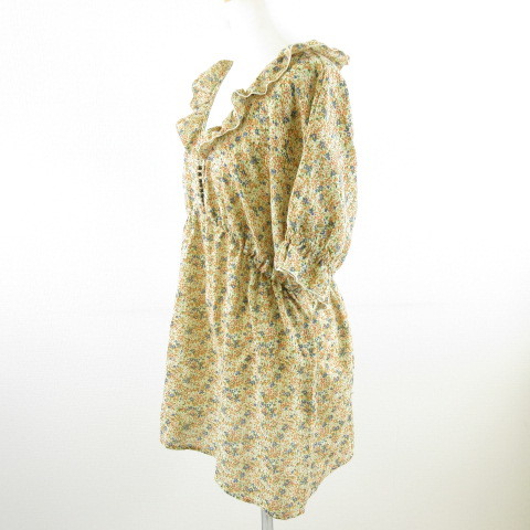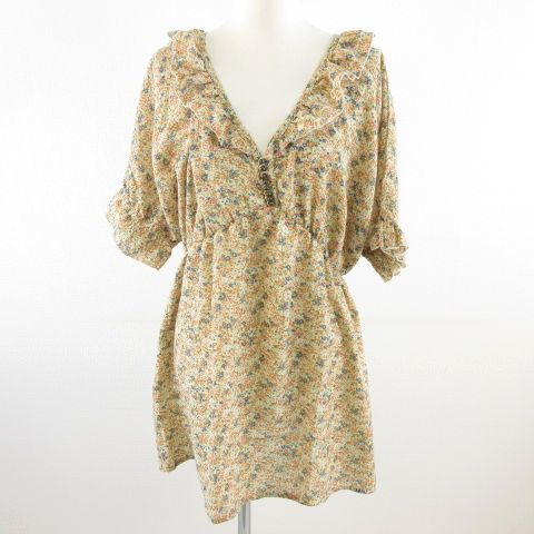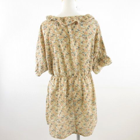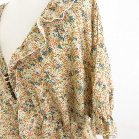 ローリーズファーム LOWRYS FARM カットソー フレンチスリーブ チュニック 花柄 七分袖 ベージュ 青 M *A730 レディース