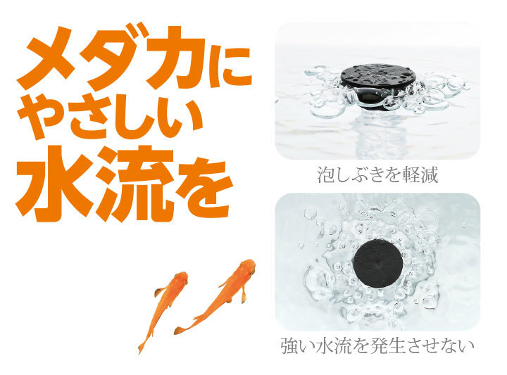 特殊設計の吐出口を際良いウすることにより、水槽内に強い水流を発生させずに酸素を供給、特殊素材の三層構造マットが大きなゴミを取り除き有害なアンモニアや亜硝酸を分解する微生物に最適な環境を作り出します。