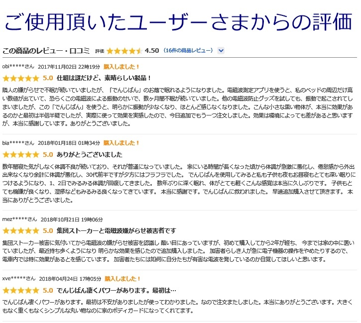 準静電界レベルの干渉による不快な電磁波過敏(EHS)、電磁波音波攻撃対策の防御製品として、家庭用自己防衛グッズ「電磁番AZ」はご利用者の皆様から高い評価を数多く頂いております。
