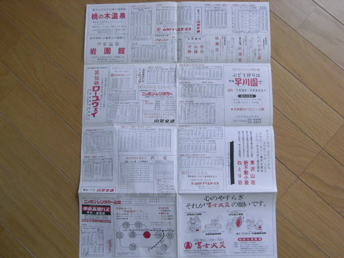 掲載:季節快速バス運転 小淵沢駅-清里・八ヶ岳ロッジ線/清里-八ヶ岳ロッジ線/韮崎-八ヶ岳ロッジ線/清里駅-八ヶ岳ロッジ線(学校経由)/清里駅-樫山線/中央高速バス 甲府-新宿線/国鉄中央本線列車時刻表(上諏訪~新宿)/(季節・快速)湯村-甲府-南アルプス・広河原線/湯村-竜王-芦安線/身延-広河原線/甲府-身延-町屋-興津-静岡線/身延-新早川橋-奈良田・雨畑線/国鉄身延線列車時刻表/韮崎-増富温泉線/韮崎-穂坂・上今井線/韮崎-浅尾/仁田平線/鰍沢-平林線/塩山-大菩薩峠登山口/塩山-勝沼・景徳院線/湯村-平岡線/塩山-新地平-西沢渓谷線/塩山-乾徳山登山線/塩山-杣口線/塩山-赤芝・洞雲寺・塩平線/貢川-千代田湖・上帯那線/貢川-清川-昇仙峡滝上線/(季節快速)甲府駅-グリーンライン昇仙峡線/貢川-湯村-グリーンライン昇仙峡/韮崎-白須-下教来石-国界橋線/韮崎-百観音-横手線/韮崎-横手線/韮崎-駒ケ岳神社/韮崎-社会福祉村・小笠原線