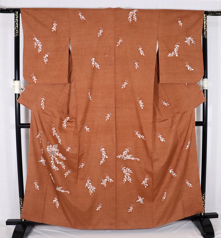 | 手織り紬 友禅訪問着 袷 赤茶暈し地 花喰鳥 168 広襟 | |