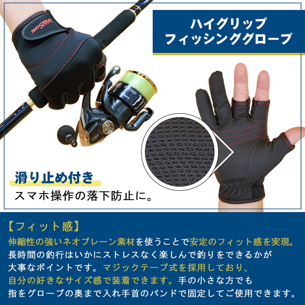・防寒対策のためだけではなく、 高いグリップ力でロッドの操作性を高めることができます。