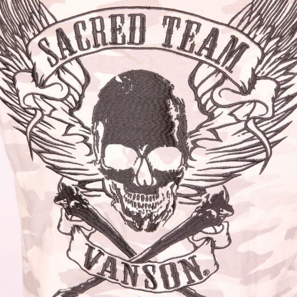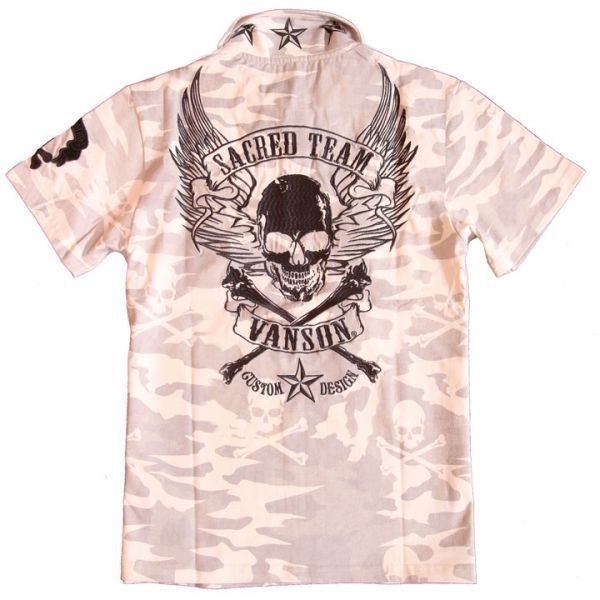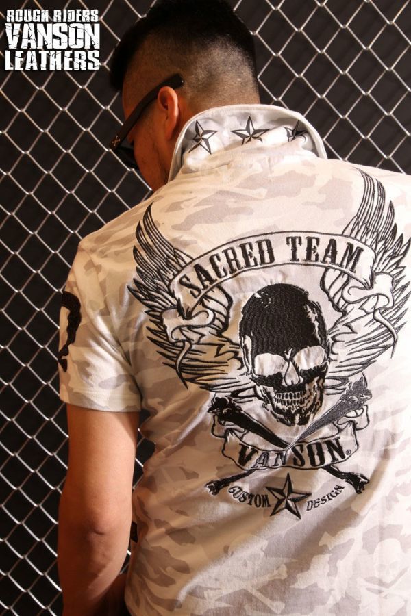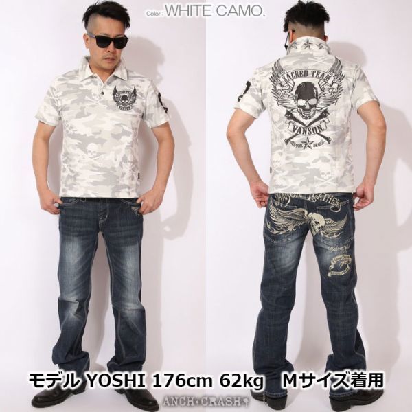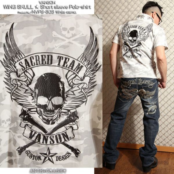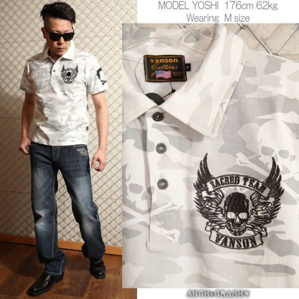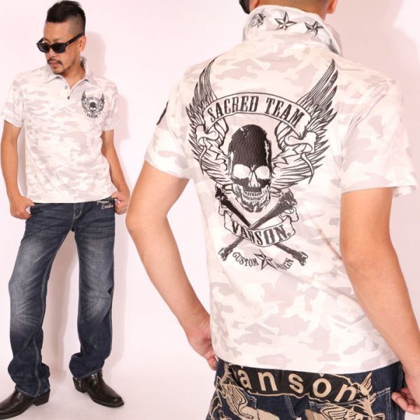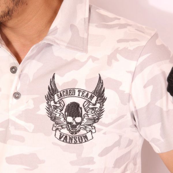 当店別注 バンソン VANSON 刺繍 半袖 ポロシャツ ホワイトカモ【Sサイズ】NVPS-303 アメカジ バイカー ドクロ スカル