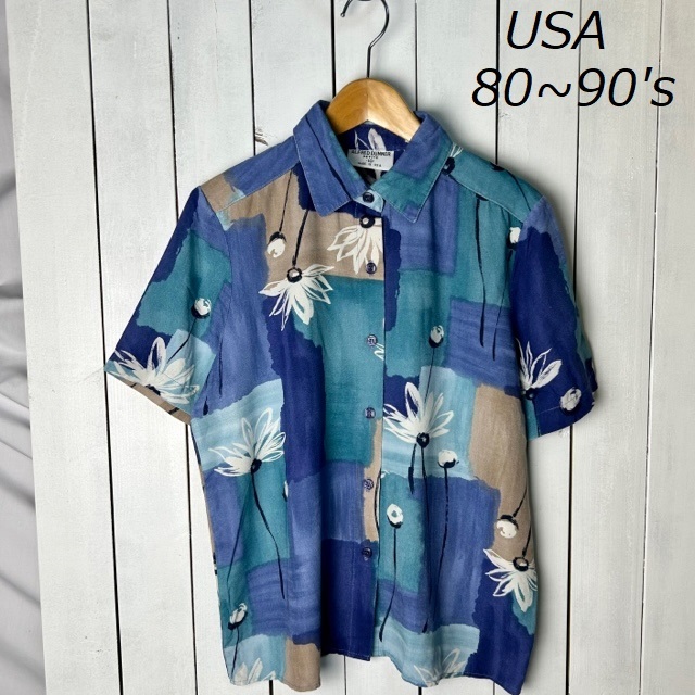 sh●520 USA古着 80s~90s USA製 レーヨン ショート丈 水彩画風柄シャツ アロハシャツ 10 オールド ヴィンテージ アメリカ古着 M~L