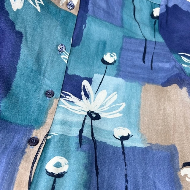 ●商品説明・・・アメリカ買い付け品になります。80年代~90年代頃のオールド・ヴィンテージのややショート丈の水彩画風な柄の柄シャツ・アロハシャツです。ボックスシルエットです。。made in USA (アメリカ製)で、表記はないですが、素材はおそらくレーヨン系で、薄手で涼しげなテロっとした質感です。USの10表記で、ゆったりしたM~L程度のサイズ感かと思います。