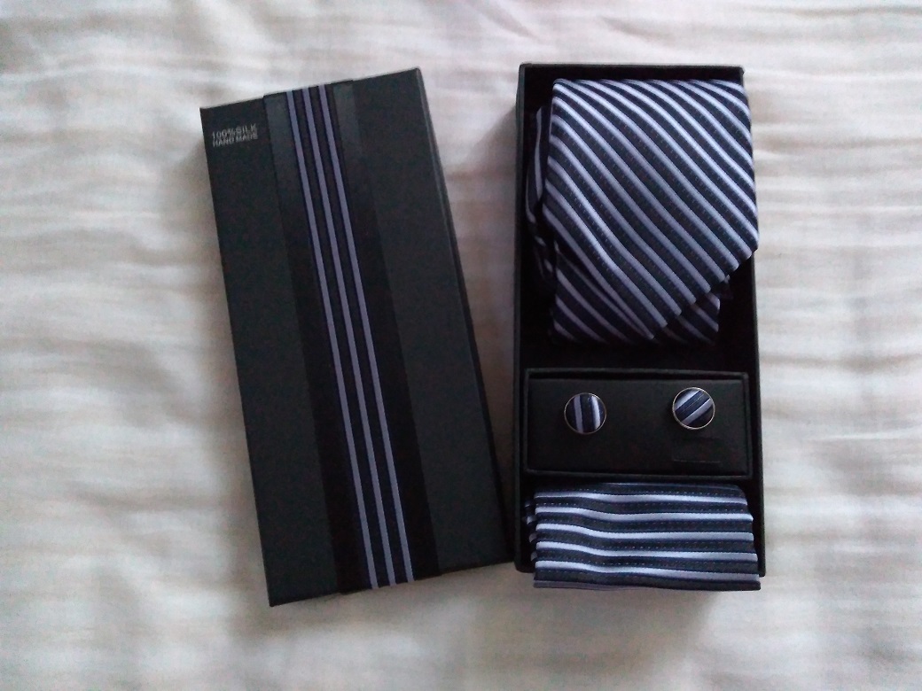 ・化粧箱付のネクタイ&カフスボタン&チーフ3点セットです。