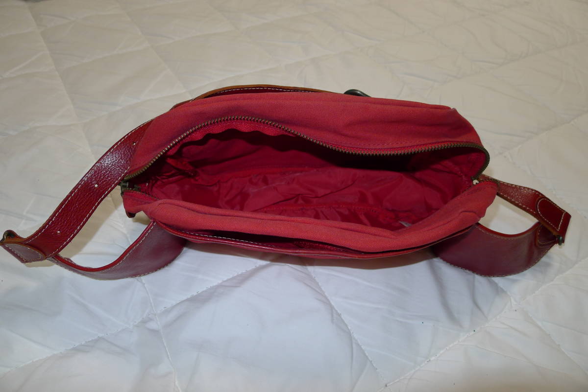 ロゼレッド 赤色地/長さ調節式ショルダー兼用ベルト・ファスナー開閉式・前面部ファスナー開閉式外縫いポケット・背面部マジックテープ開閉式オープンポケット・内部オープンポケット×1 など