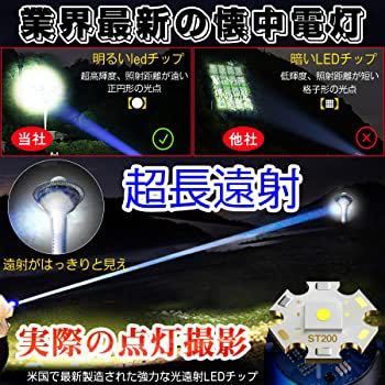 【最適化版超高輝度・ 超長遠射・懐中電灯】この新型充電式懐中電灯は、世界最新型のLED強光チップST200を採用し、使用寿命は1500000 Hに達します。明るく、光が均一で、暗闇でも周囲を照らせて安全です。防爆防破対策(アクリル材質)した大型球面レンズは、絞りが大きいだけでなく、照射範囲も広いです。(150 m会議室を容易に照らせる)超強力な光透過性を持ち、超高輝度で、非常に優れたフォーカス機能を持ち、照射距離は最大ルに達します。P160、P360等に比べると、輝度が90%上昇、照射距離が99%上昇し、より高い使用性能を持っています。この多機能懐中電灯は、小型懐中電灯の中でも最強クラスと言われ、超高輝度商品(決して目で直視しないでください!)として広く愛用されています。