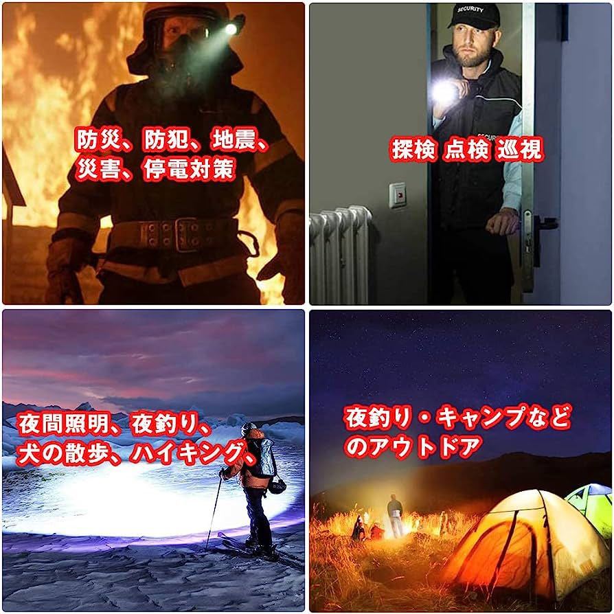 【長押しOFF・5つのモード調光】アップグレード版スイッチの設計は従来の消灯不便を回避したので、任意モードスイッチを長押すだけで、すばやく照明をオフにできます。オフにするためにすべてのモードを循環する必要がある他の日本製懐中電灯よりも操作する方が便利です。用途に合わせて5段階の点灯モードを切り替える事が出来ます。懐中電灯ライトの操作は非常に簡単で、電源ボタンを押すだけで、低輝度、中輝度、高輝度、ストロボ、SOSモードを調節可能です。また、必要に応じて、この高輝度懐中電灯のヘッドを伸縮させて焦点距離を調整したり、長距離スポットライトや大面積フラッドライトを自由に選択したりできます。 夜間照明、犬の散歩、ハイキング、釣り、停電、地震、災害緊急対策などの緊急時の使用に非常に適しています。