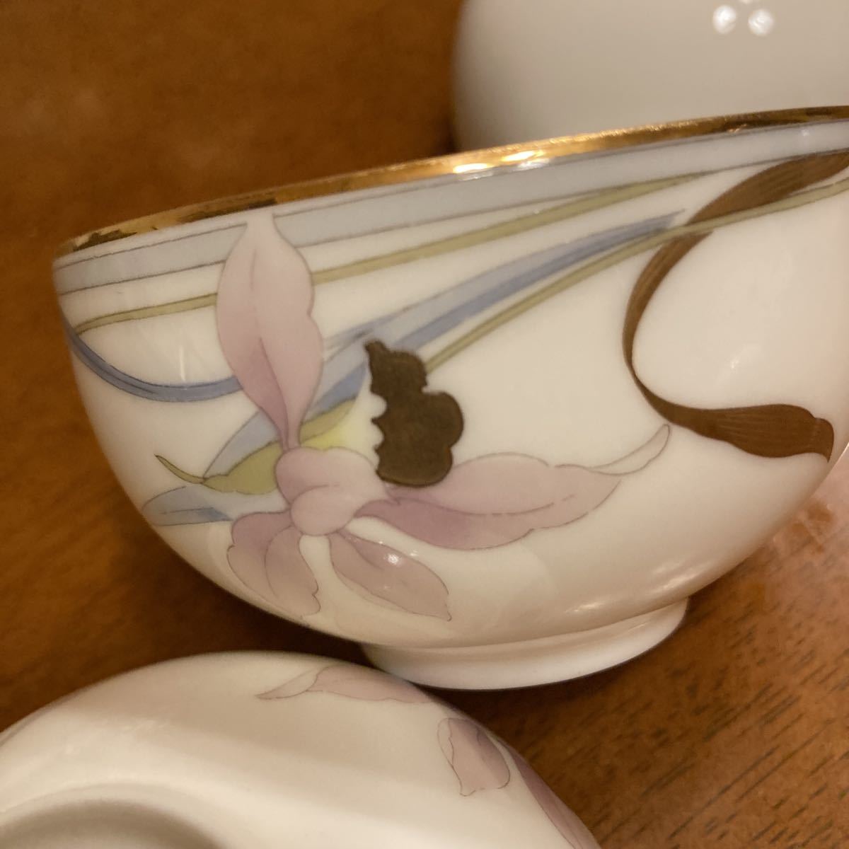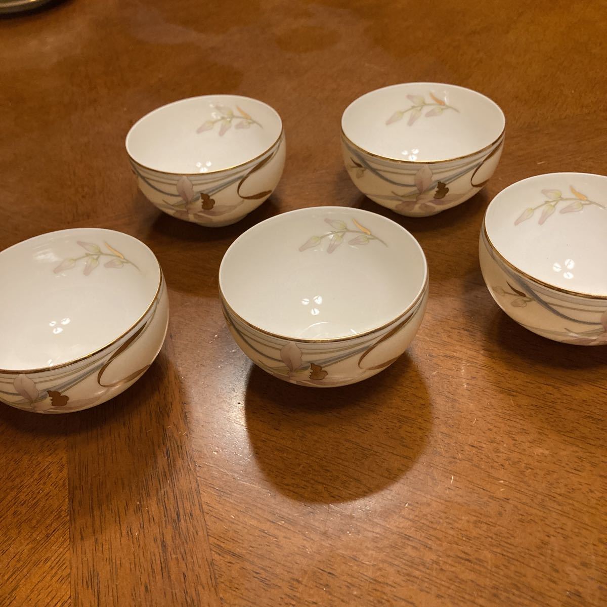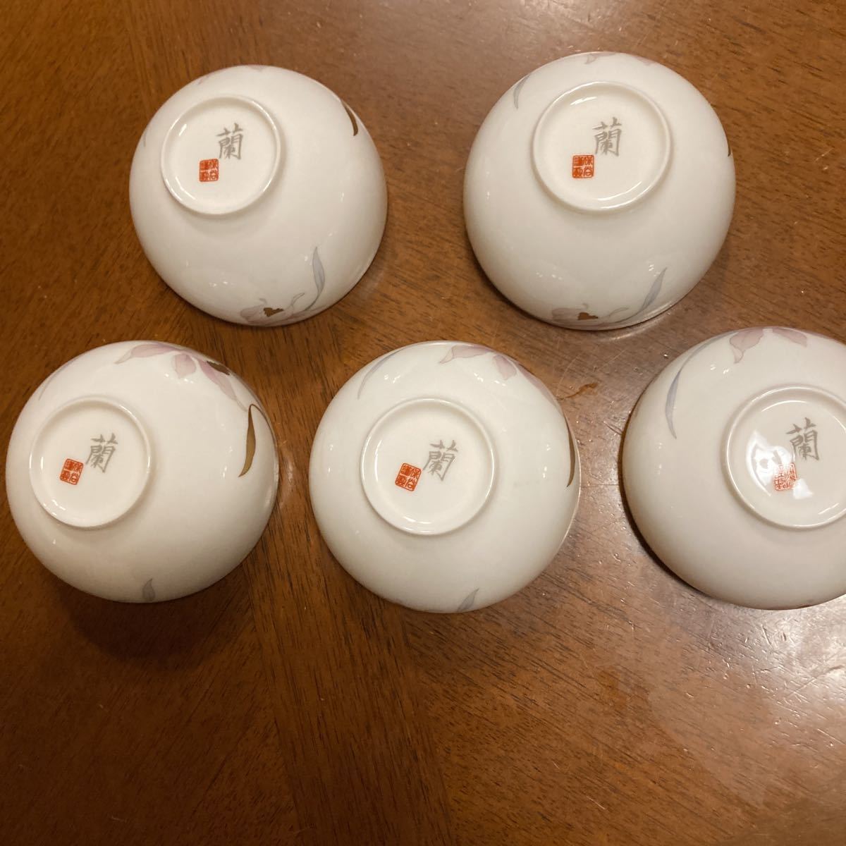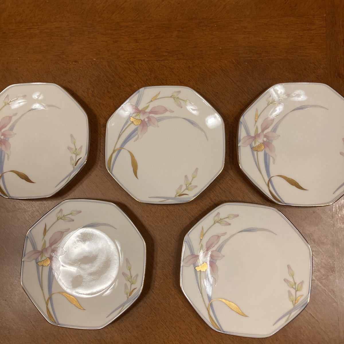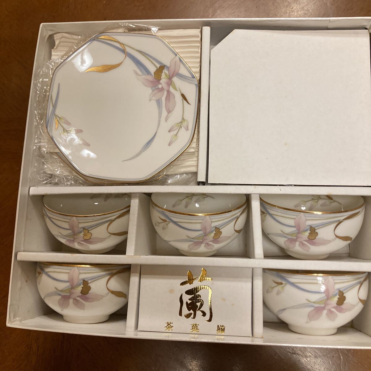 蘭の絵柄が美しい茶菓セットです。5客セット、綺麗な、専用箱ににはいっています。映像でよくお確かめの上,入札宜しくお願いします。