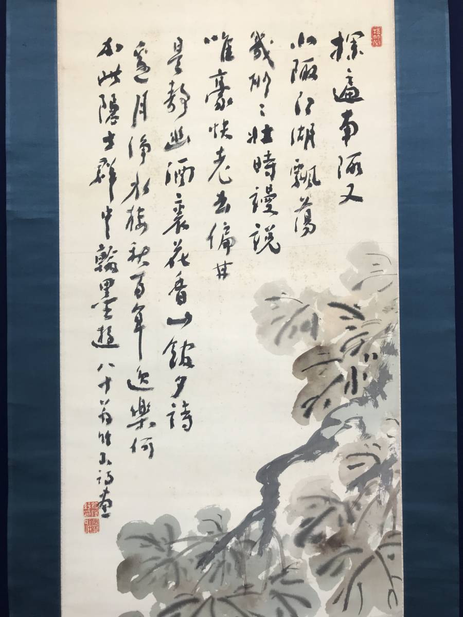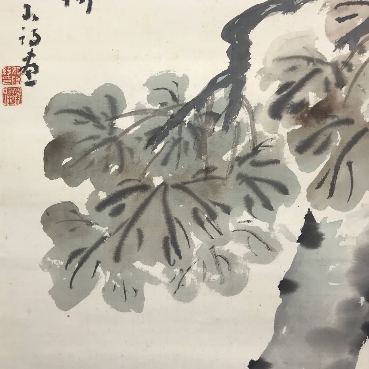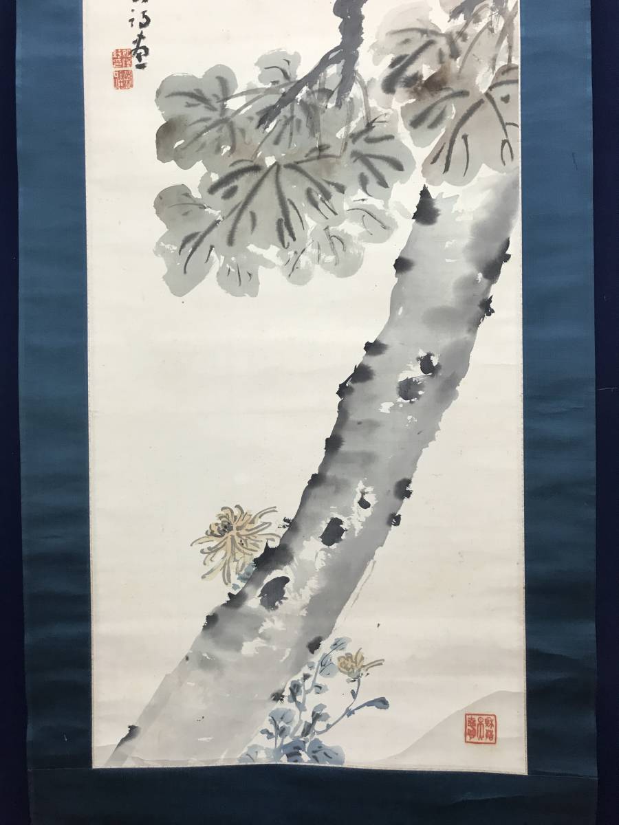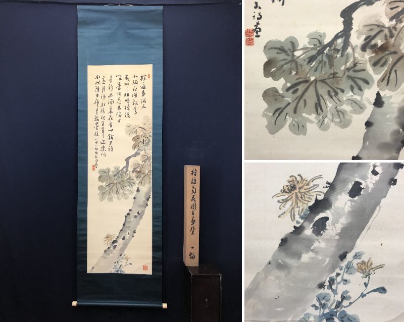 真作/姫島竹外/梧陰菊花図/桐に菊花図/自画賛//掛軸☆宝船☆AC-314