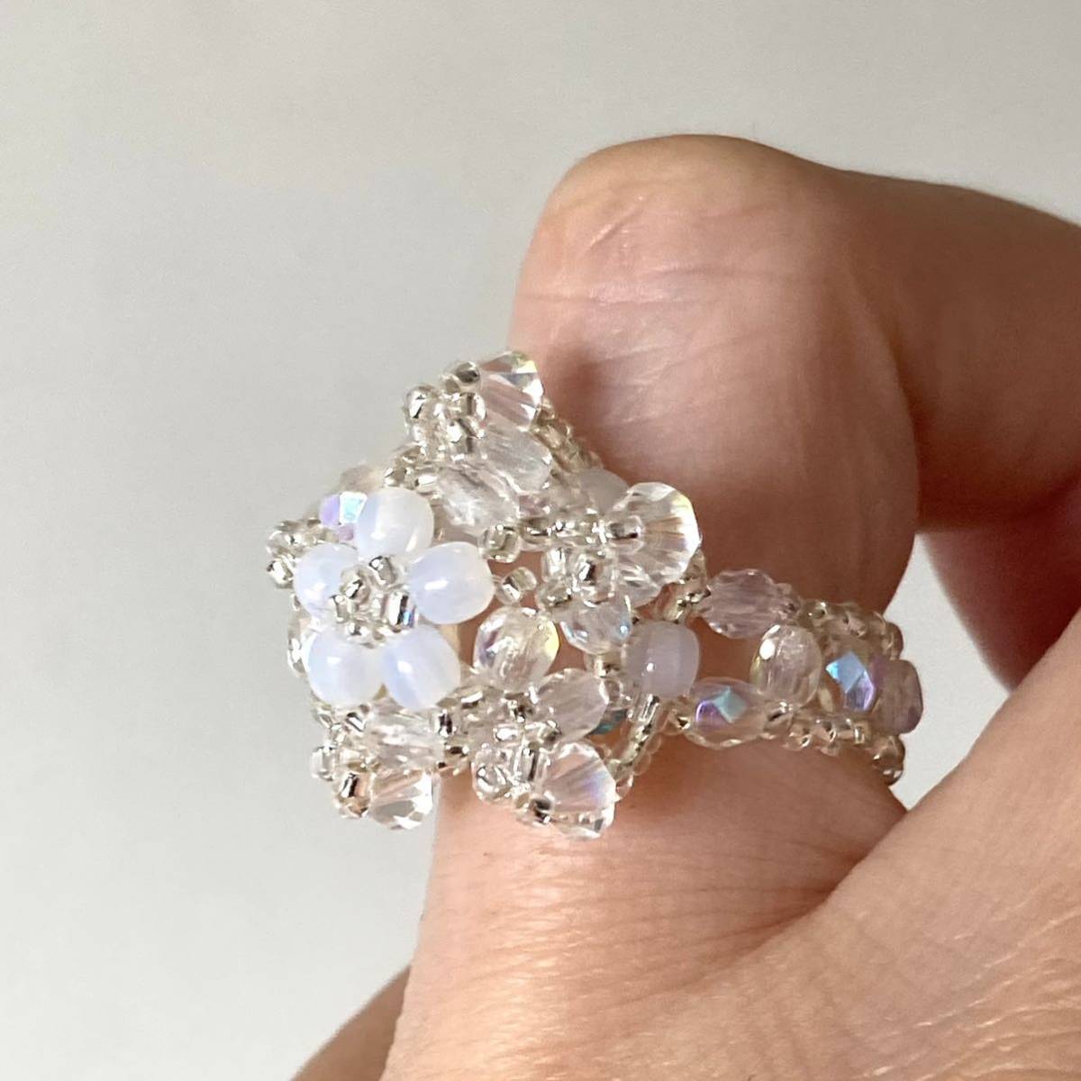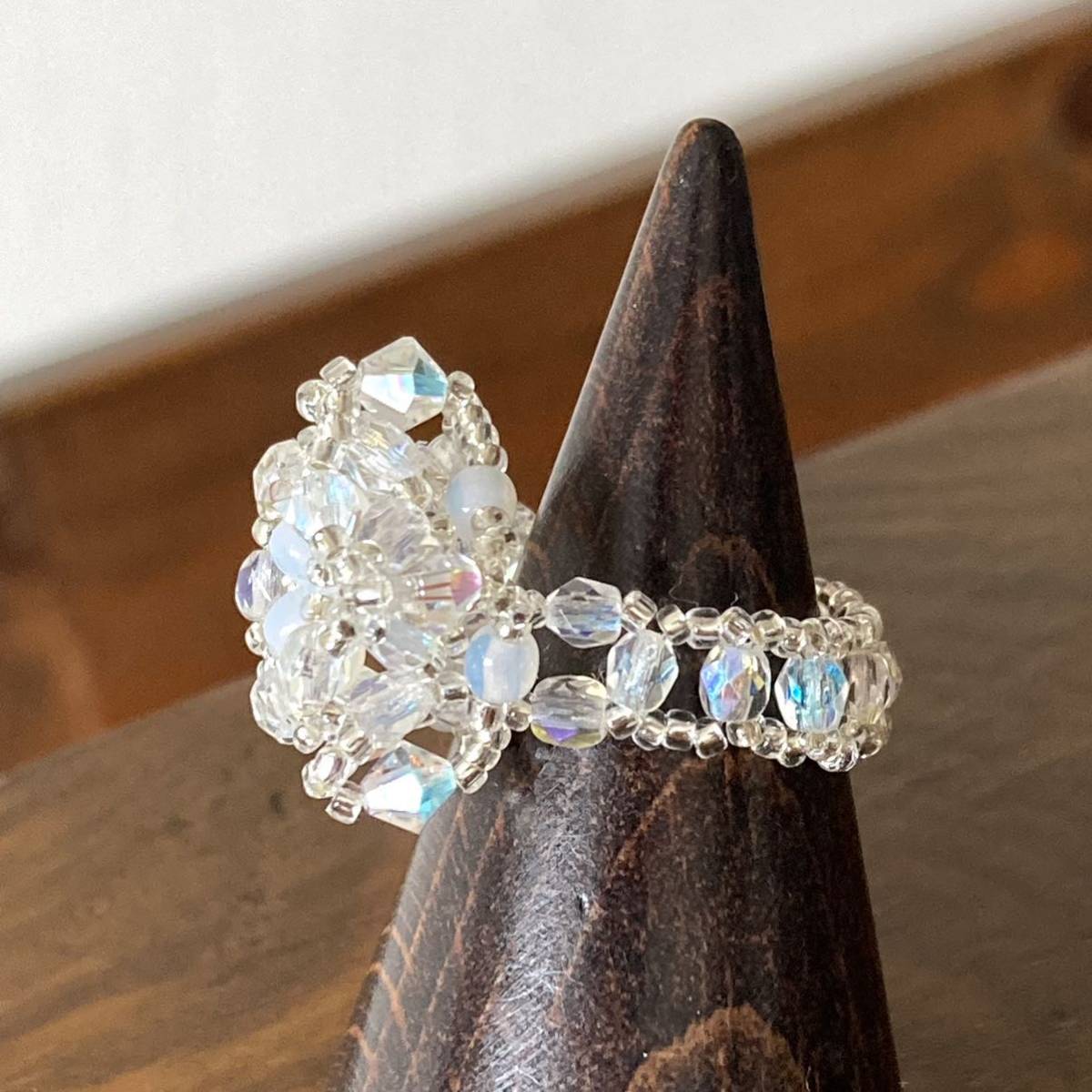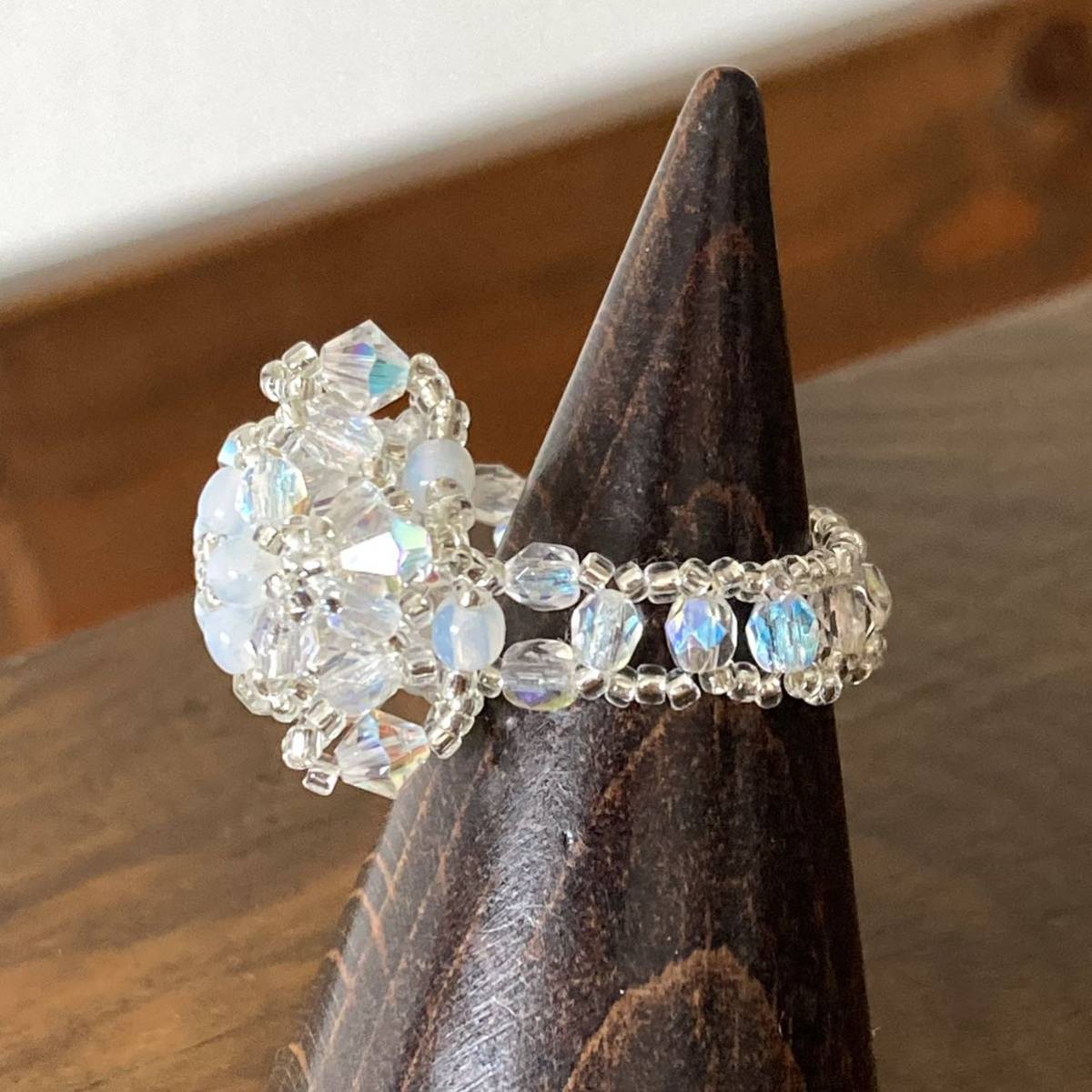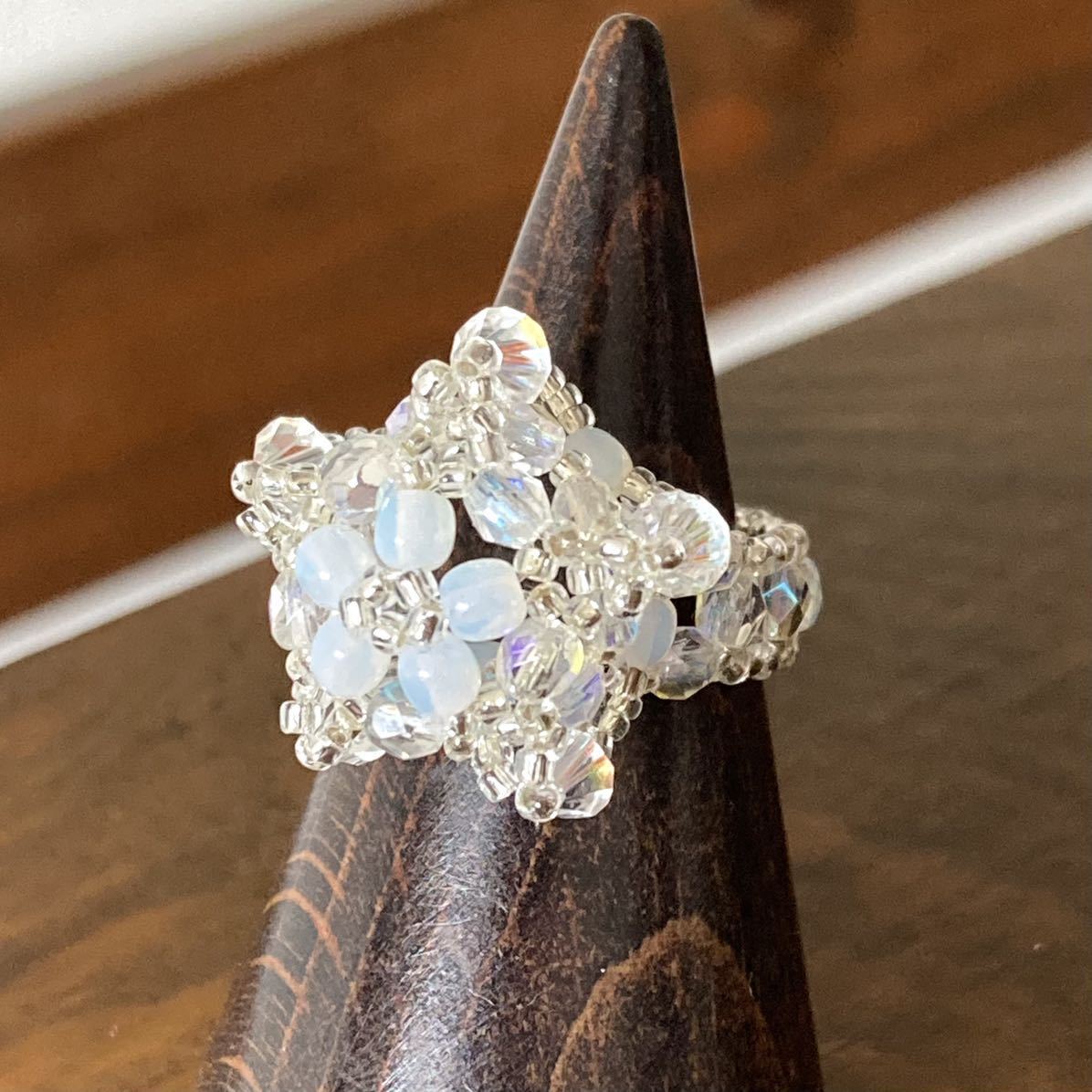 3mmの乳白色、クリアオーロラのチェコビーズ、4mmのクリアオーロラのスワロフスキー、クリアシルバーの特小ビーズで作ったリングです。