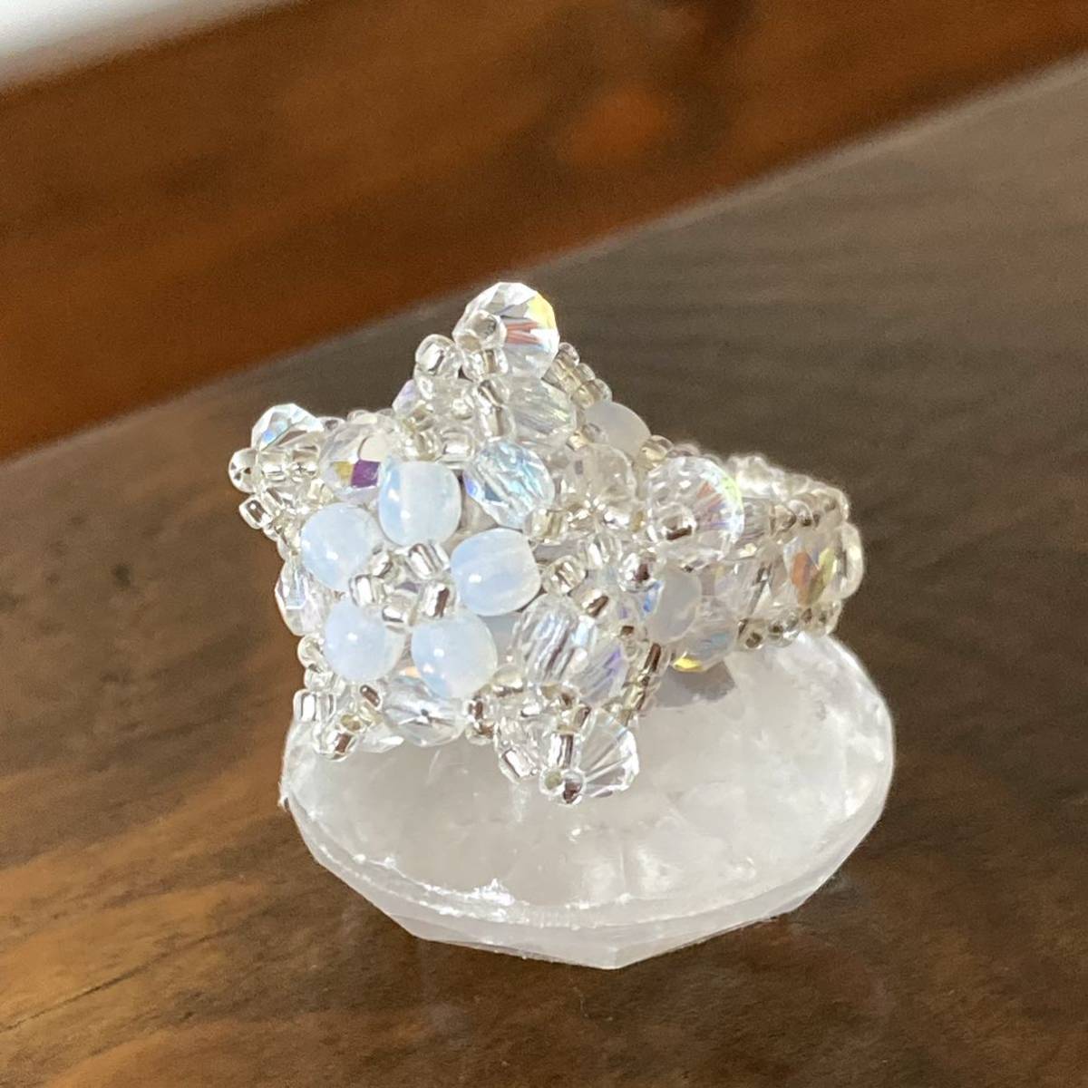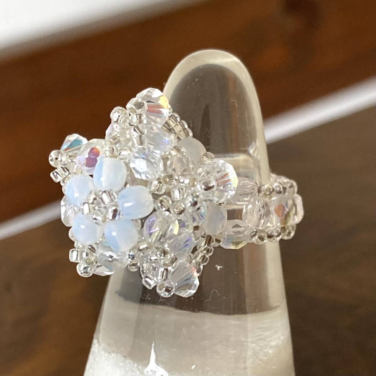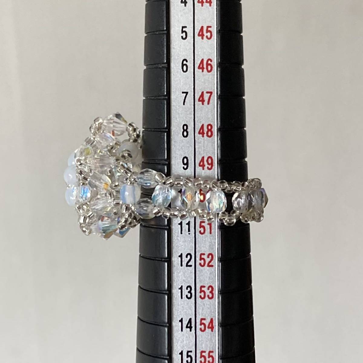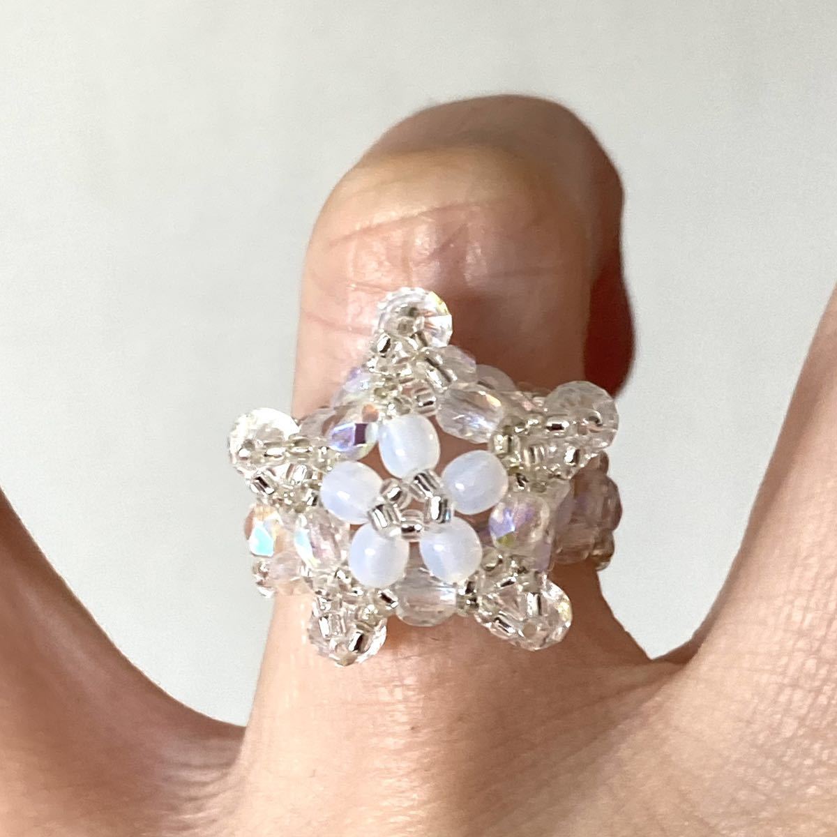 3mmの乳白色、クリアオーロラのチェコビーズ、4mmのクリアオーロラのスワロフスキー、クリアシルバーの特小ビーズで作ったリングです。