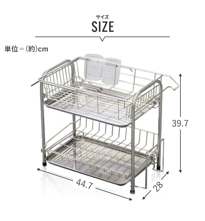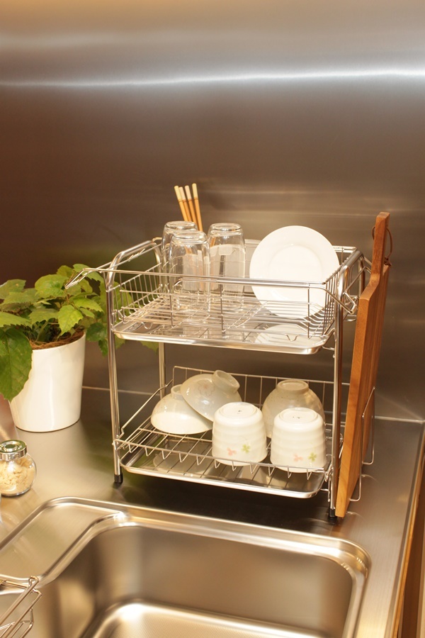 さびに強いステンレス仕様の水切りラック 2段 ワイドタイプ。