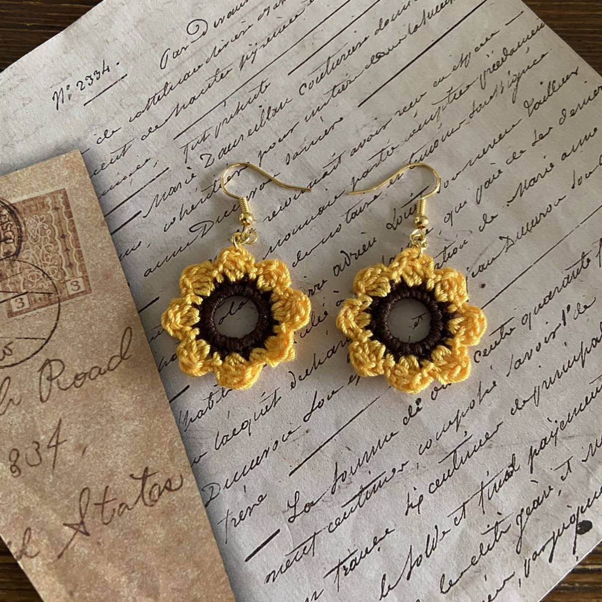 ハンドメイド、レース糸で編んだ、リングひまわりピアスです。