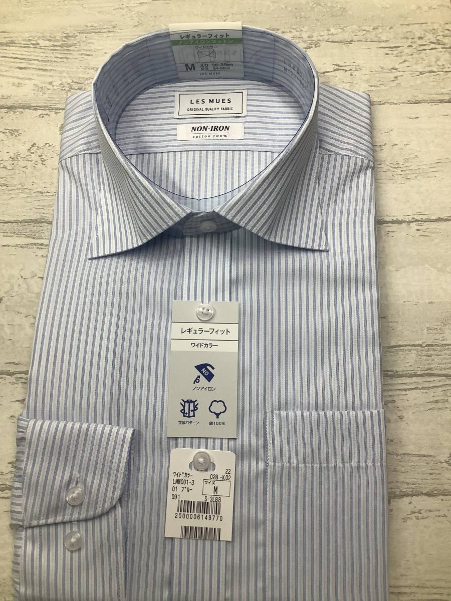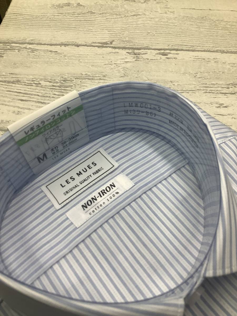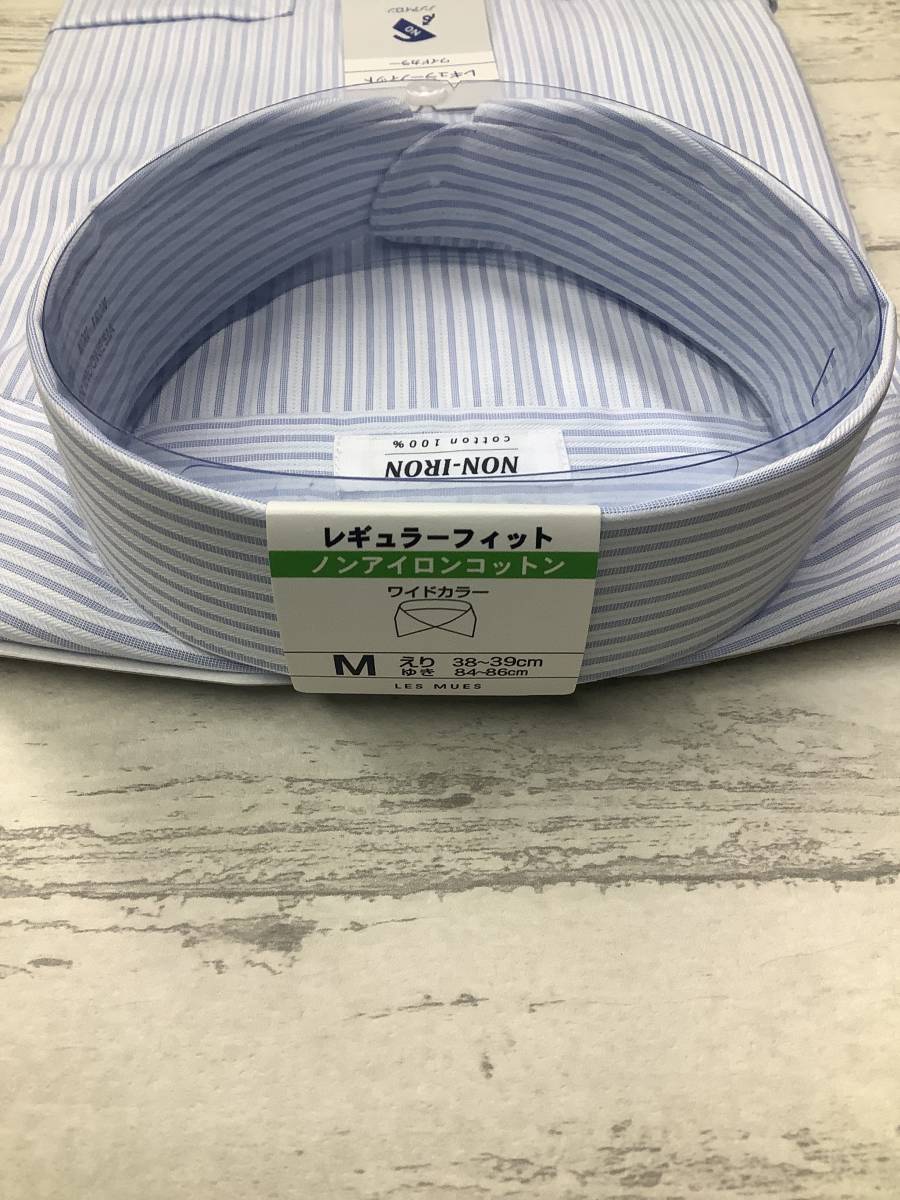 新品 39-86 長袖 Mサイズ ワイドカラーシャツ★ドレスシャツ ノンアイロン綿100%☆サックス系、柄ストライプ★