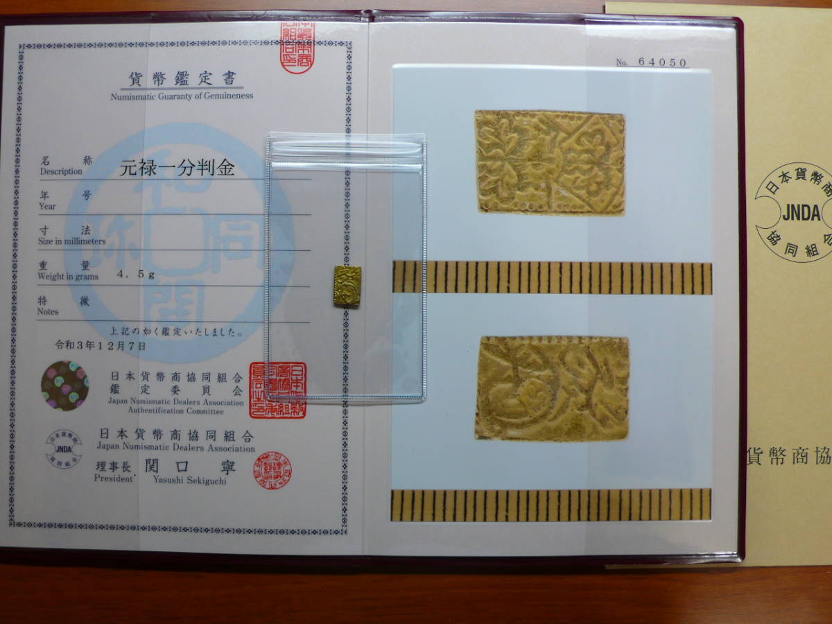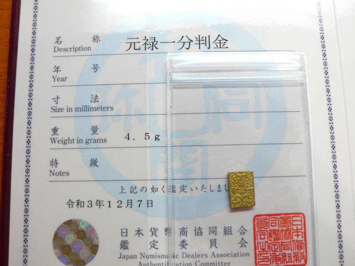 元禄一分判金 無刻印 桐極印 表面額縁 4.5g 組合鑑定書 №1 裏面・元の文字明瞭 専用封筒等付属品一式 送料当方負担 元禄一分金