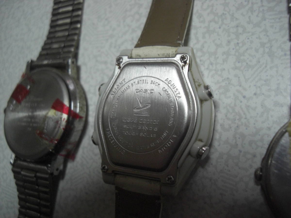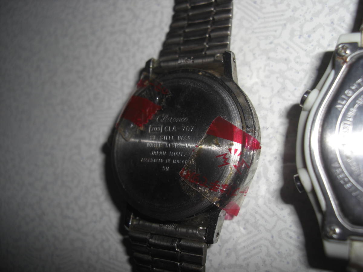 ご覧の様な商品です。経年の状態です。長らく保管して居ました。セイコー、カシオ、CLARENCLのクオーツ時計3個です。電池切れ?作動未確認です。裏蓋を外した物も有ります。ジャンク品と致します。中古品です、タイトル間違え、