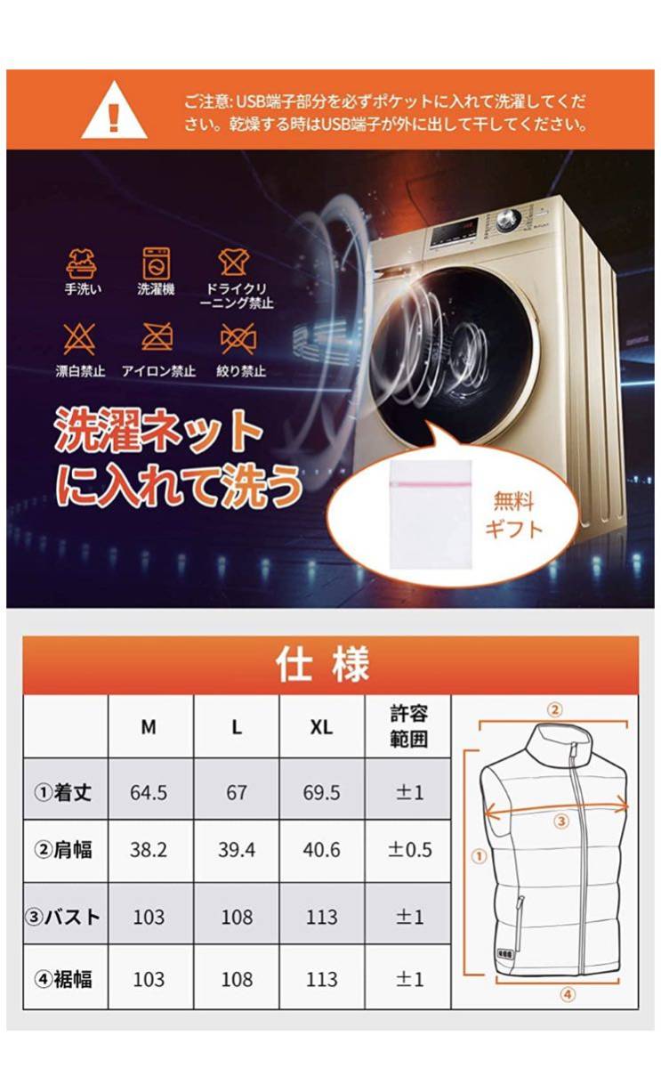 【洗濯について】手洗うことや洗濯機で両方洗えます。二つの方法とも加熱服の内部発熱システムに影響を与えません。ご安心に使用してください。※ご注意:洗濯する前に、モバイルバッテリーを取り出しUSBケーブルをポケットの中に収納して、服を洗濯ネットに入れてから洗濯機に入れてください。