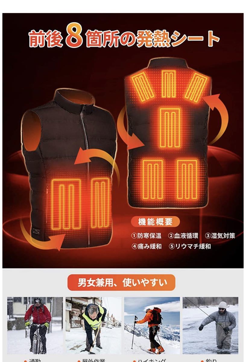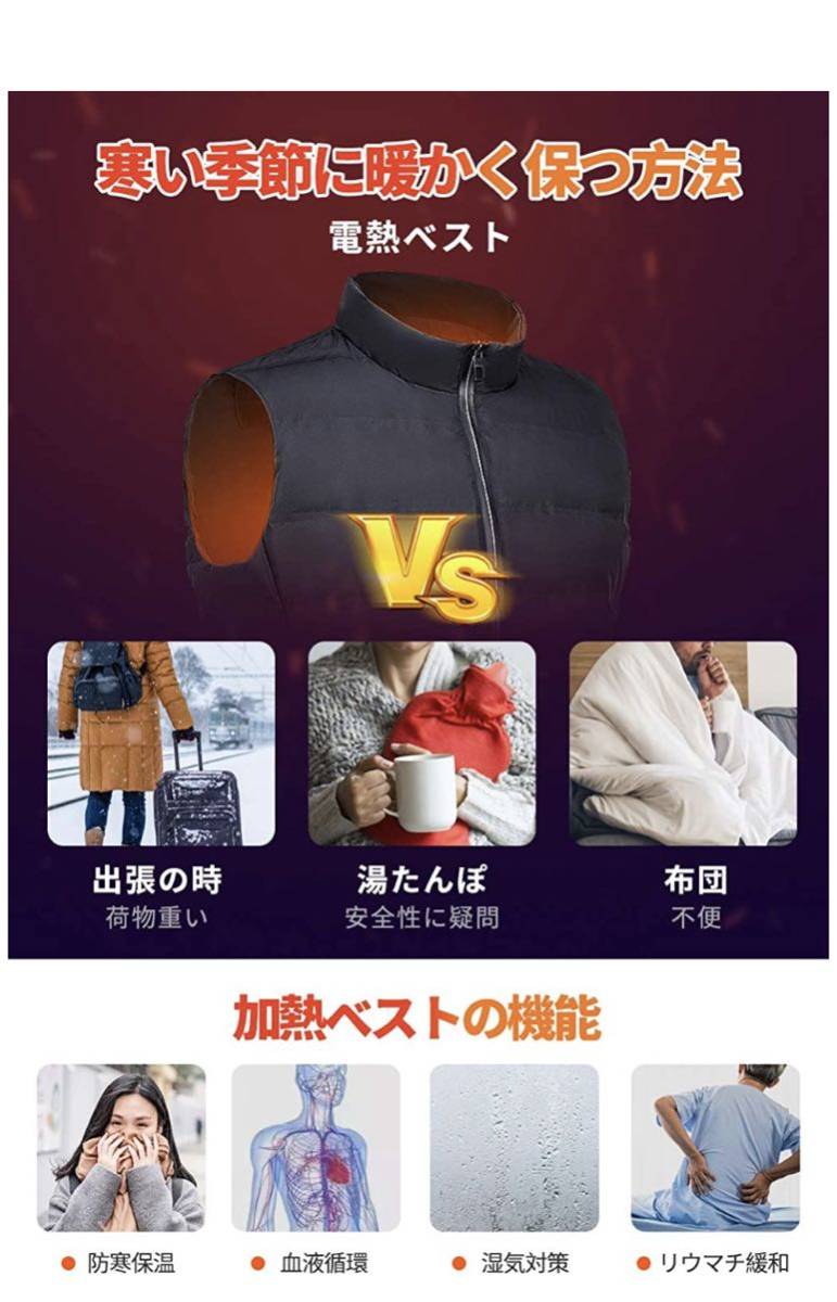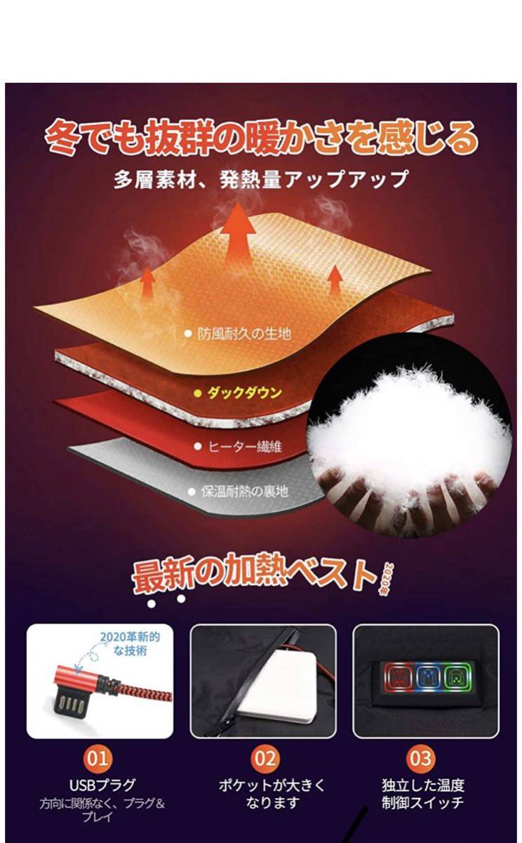 【最高なダウンベスト+USBプラグ】ダウンベストの排湿性はとても強くて、着ていて体に通気性があって乾きやすい。軽くてふわふわしていて、いつも快適になります。身に着けると圧迫感がありません。商品を受け取った後は、ダウンが跳ね返って拡大できるように、服を軽くたたいて振動させることをお勧めします。電熱ベストの充電USBケーブルは、両面的な挿し方向です。直接にモバイルバッテリーのUSBソケットに挿入して使えできます。ヒートベスト 電気ベスト 温熱ベスト 電熱ジャケット 加熱服 電熱チョッキ 電熱ウエア