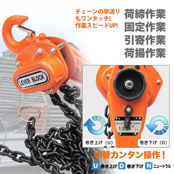 ★チェン荷締機 ★ レバーホイスト1500kg 【ポイント】 短いハンドルでコンパクト!手動力で軽く、スムーズな巻下げ可能です。 作業効率アップすること間違いなし! 外れ防止付きフックラッチを採用で確実固定し、変形、損傷しにくい鉄板を採用しています。 【商品名】 レバーホイスト 【商品番号】 lb-hyst-150 【商品仕様】 最大能力:1.50トン(1500kg) フック開口寸法:約25mm ハンドルの長さ:約430mm 上下フック間最小寸法:約430mm 巻き取りチェーンの長さ:約1500mm 重量:約12kg 【注意事項】 ※輸入品につき本体に僅かなキズ・さび・れなどがつく場合があります。 ※入荷時期により予告無くデザイン・色・サイズなど、細かな仕様が変更される場合がございます。 ※色合いの感じ方には個人差があり、撮影状況・PC環境により色合いが異なる場合がございます。 ※細かい点が気になる方、神経質な方はご注文お控えください。 ※使用中に発生した、人のけがや物品の破損など保障いたしません。十分に気を付けてご使用ください。 ご注文前に必ずご確認下さい ⇒ お買い物ガイド |